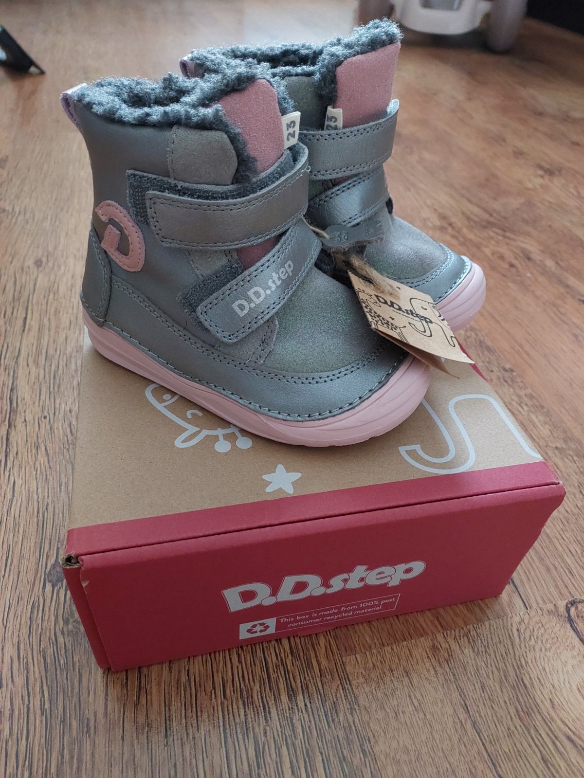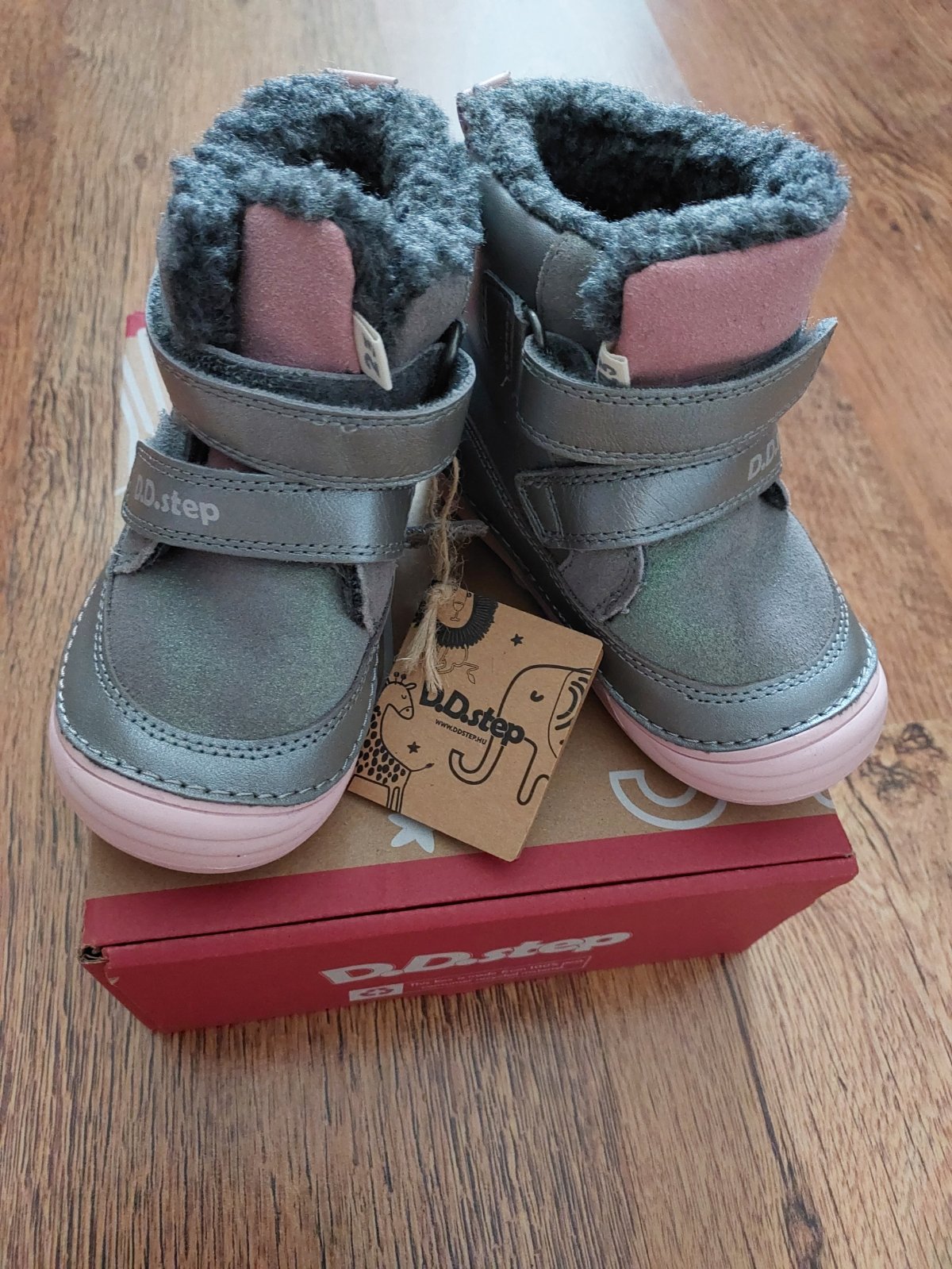Predám zimné, kožené barefoot topánky značky D.D.step v striebornej farbe, vo veľkosti 23. Topánky boli nosené jednu sezónu, sú vo veľmi dobrom stave, bez poškodení. Vnútorná dĺžka na fotke. Cena20...