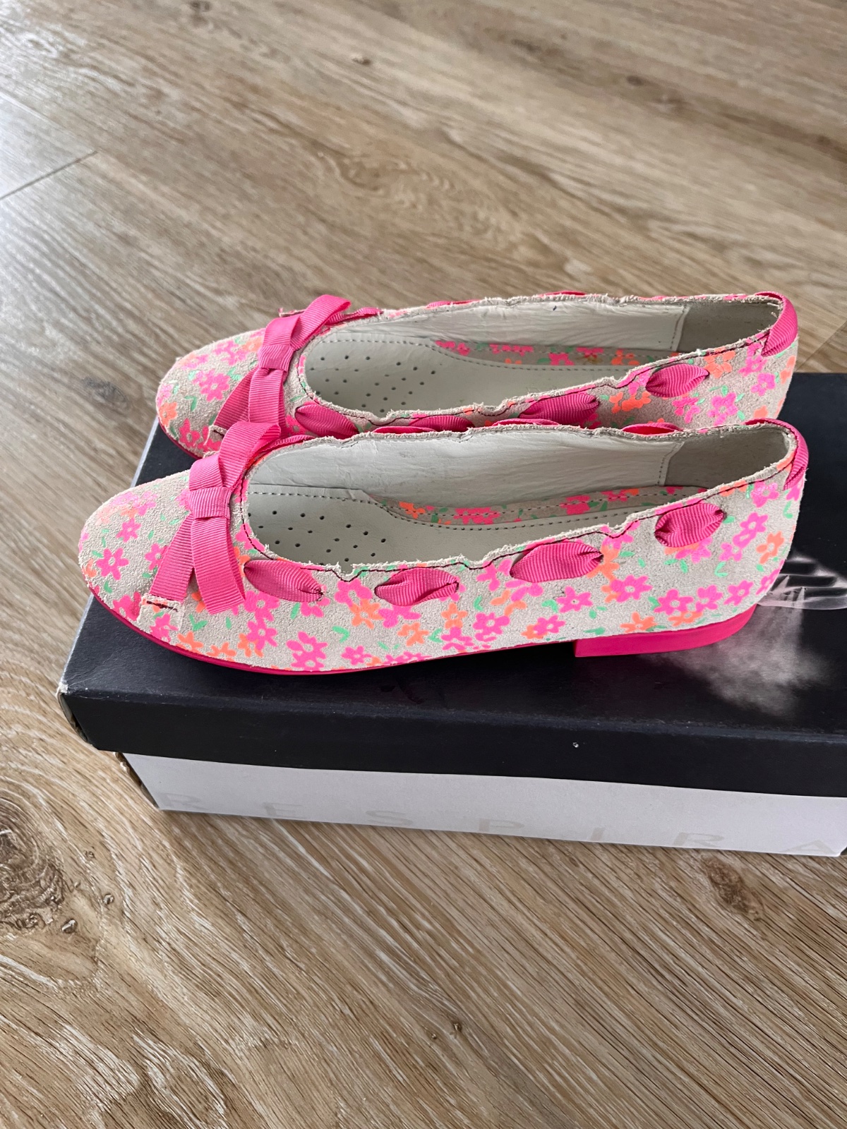 Krásne balerínky - predpokladám brúsená koža. Stielka kožená, ktorá dýcha. Gumená ohybná podrážka. Dcérka ich nestihla nosiť, lebo som ich kupovala v predstihu a zabusli sme na ne :-/ . Uvádzaná veľkosť 31, ale sú ako 30.