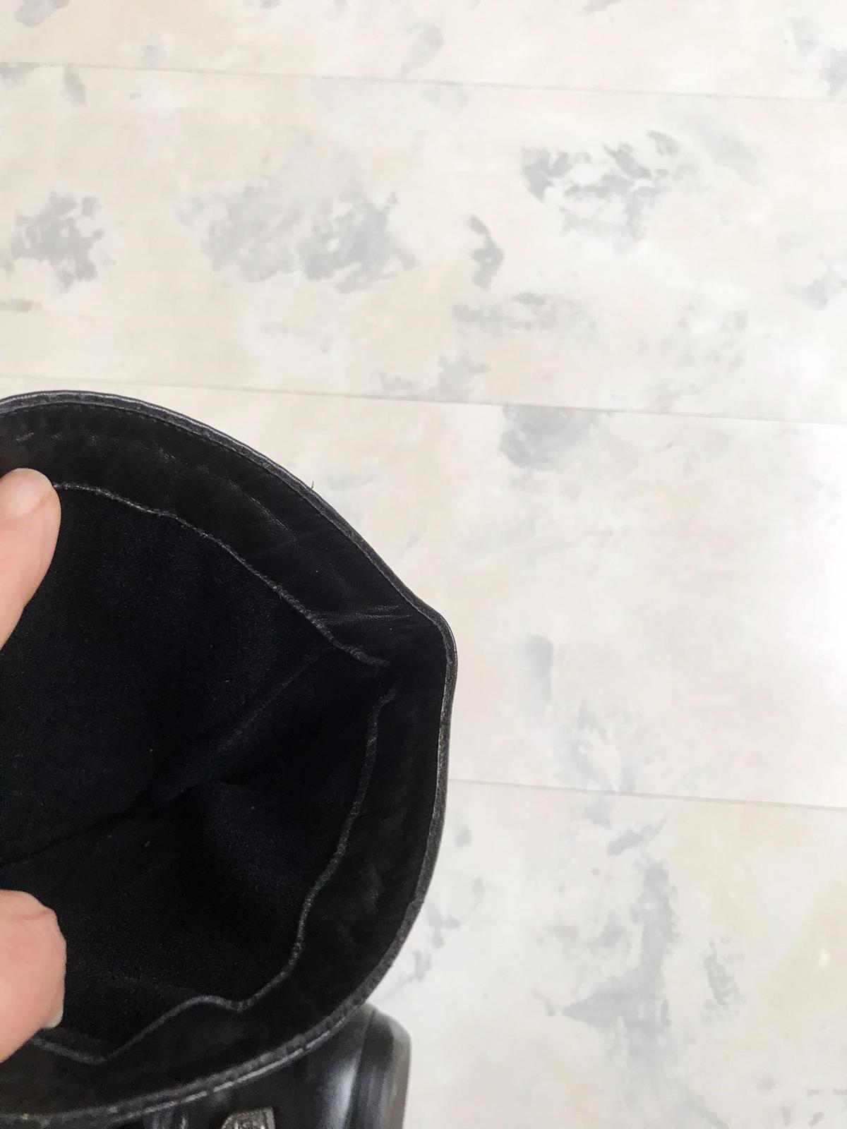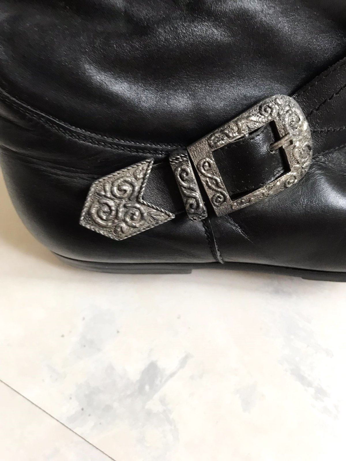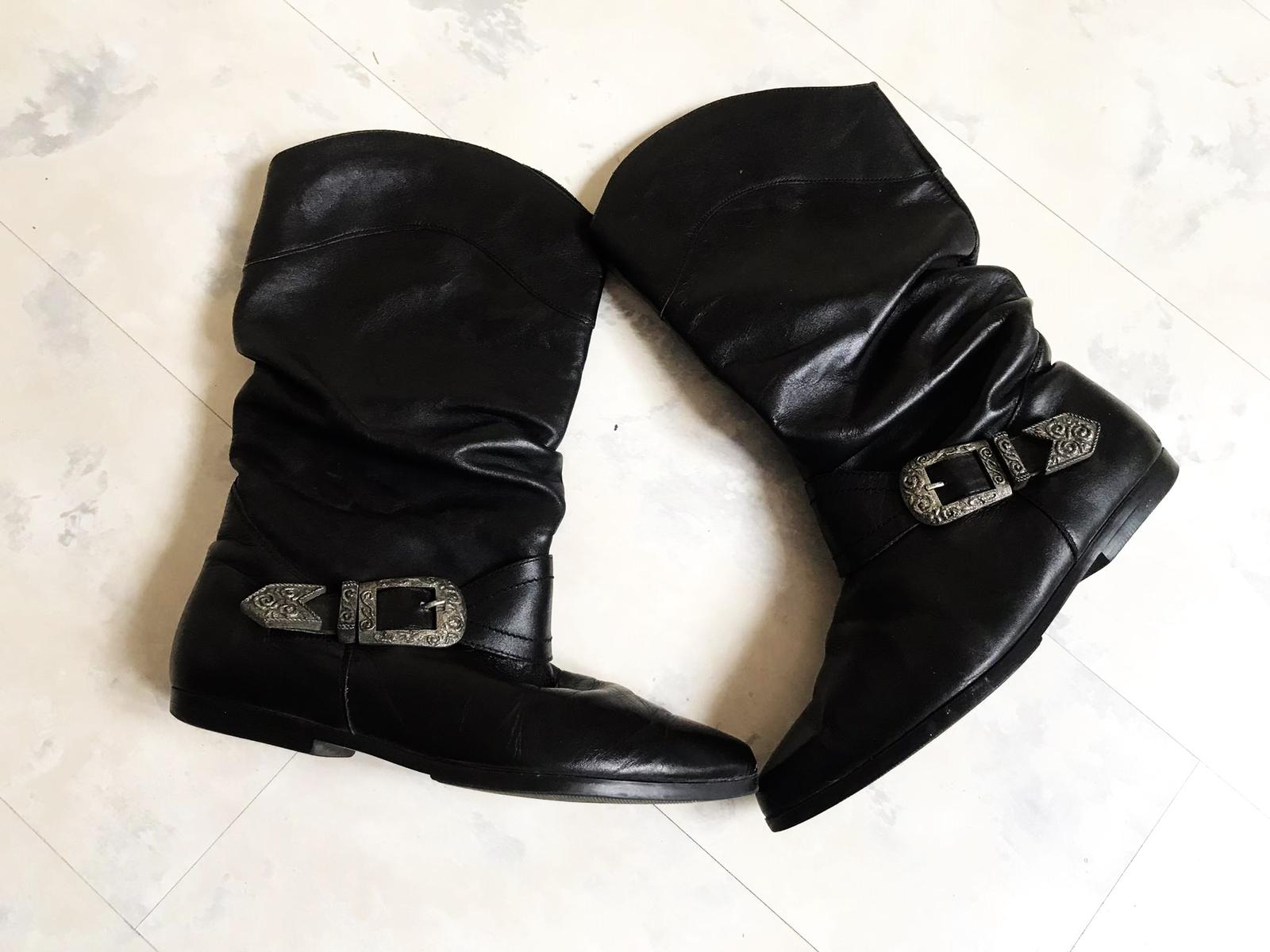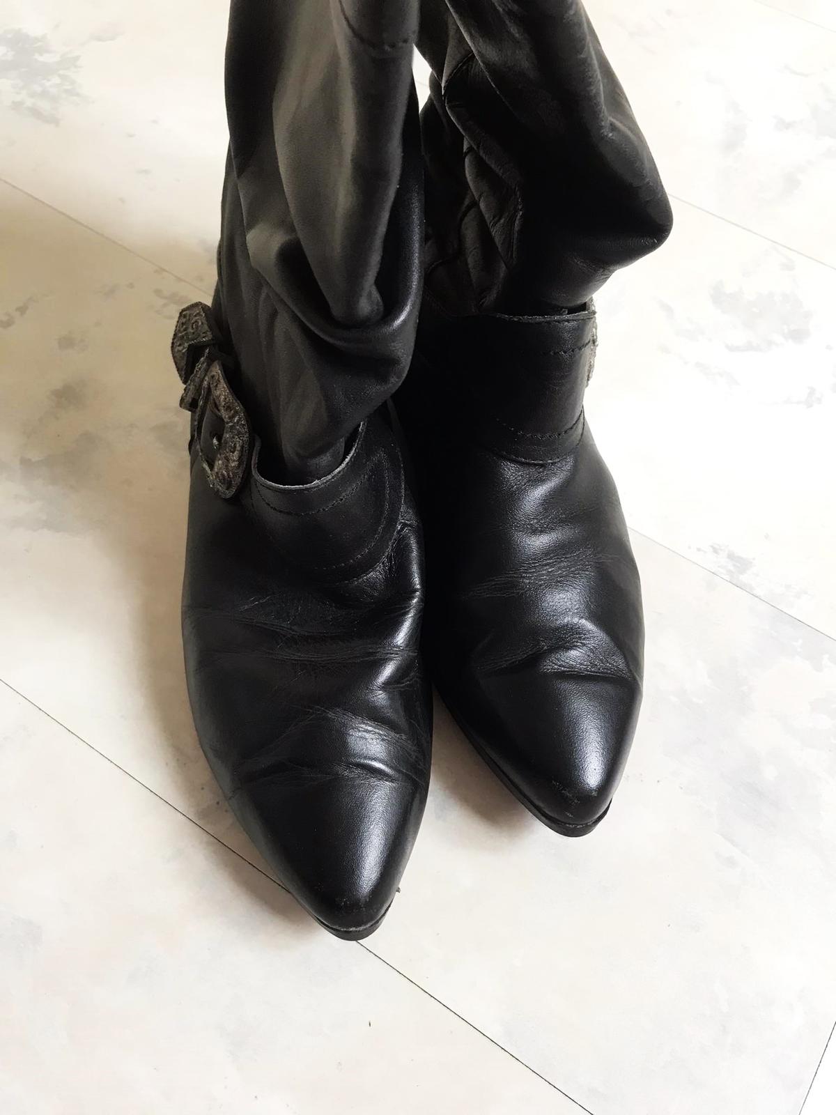 zaujímavé veľmi zachovalé čižmy, dnu jemne zateplené,obvod sáry hore = 40 cm, vnut.dlžka = 24 cm,veľmi pekná spona,v členku jemné riasenie,pekná matná povrchová úprava - vyzerá ako koža,no neviem či je to koža alebo imitácia