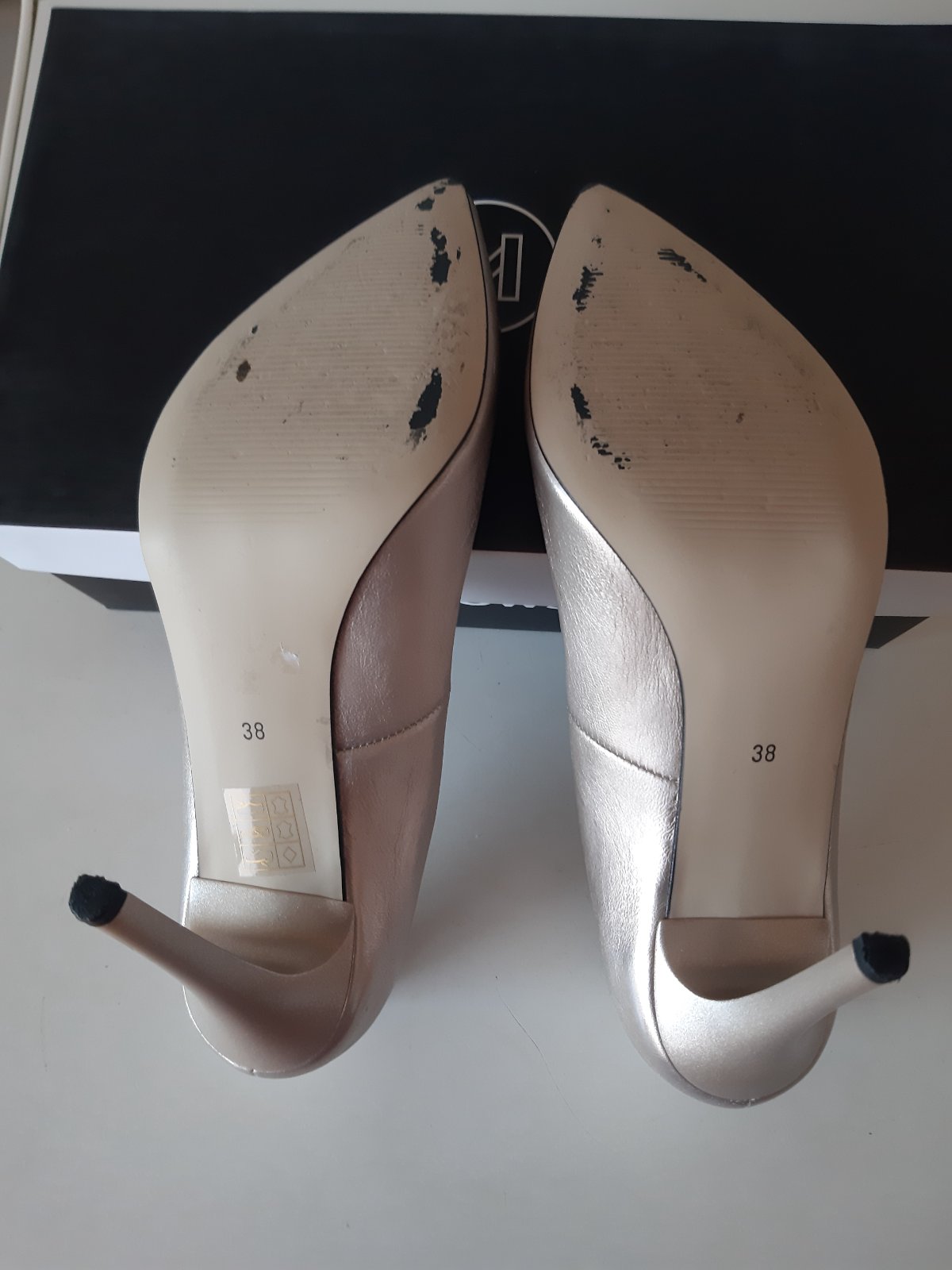 Zlaté kožené spoločenské lodičky obuté 2 x opätok výška 9,5 cm pôvodná cena 70 eur teraz predám za 39 eur + poštovné.