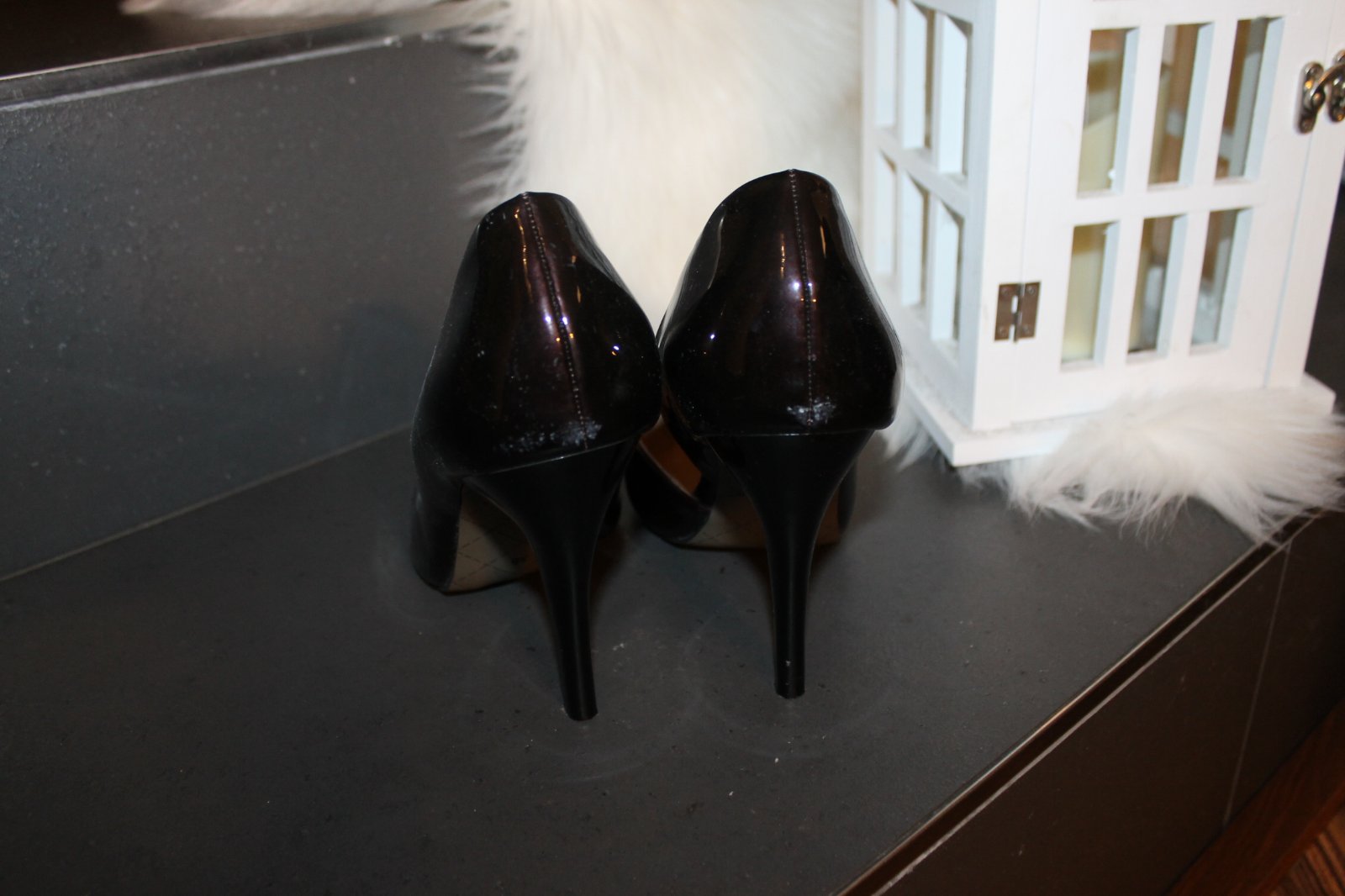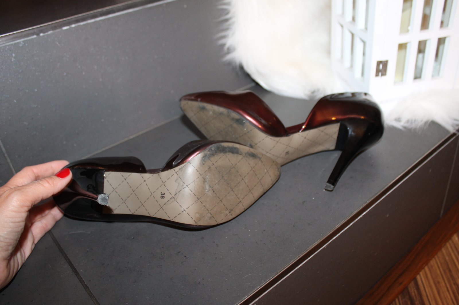 Málo nosené, vystlané, mäkké. Pravý opätok trochu oškretý (viď detail), inak bez poškodení. Veľ. 38, vn. dl. 24,5 cm. Výška podpätku 10 cm. Váha 420 g bez škatule.