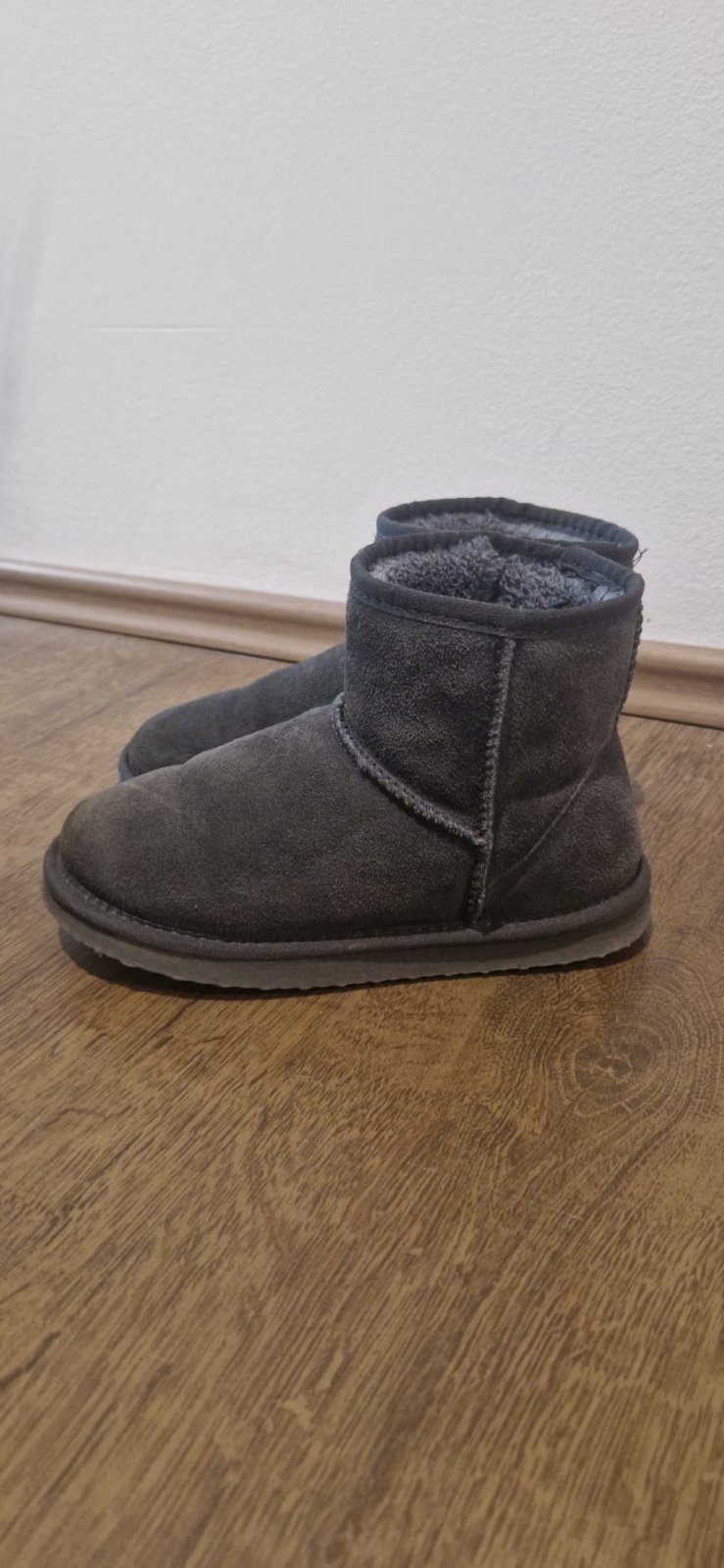100% stav, krásne detaily, je písaná veľkosť uk4, celková dĺžka podrážky 26 cm, velkova vnútorná 24 cm.. tak na 23 cm nôžku, vo vnútri niečo ako flis s kratučkým chlpkom, take jemne zateplenie
