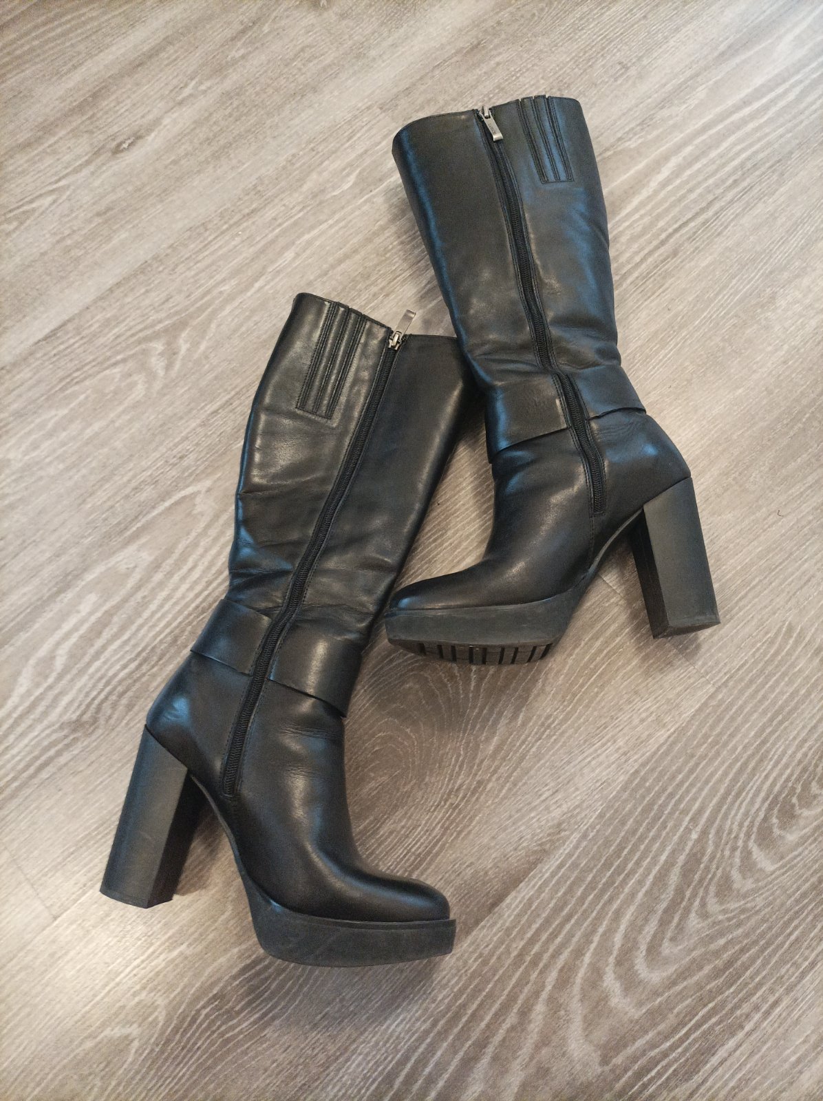 Vnútro ovčie rúno. Zvršok brúsená koža. Opätok a podošva guma, výborný sklon, na bežné nosenie. Na boku topanky polovičný zips. Krabicu už nemám. Model na úzske lýtko! - šírka 18cmx2 Pôvodná cena...