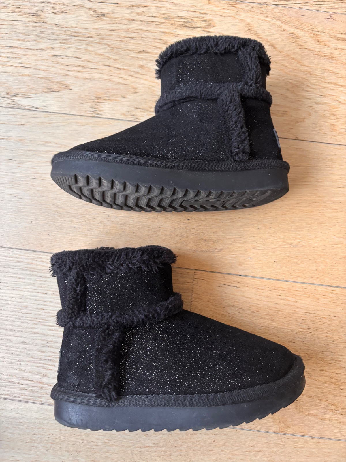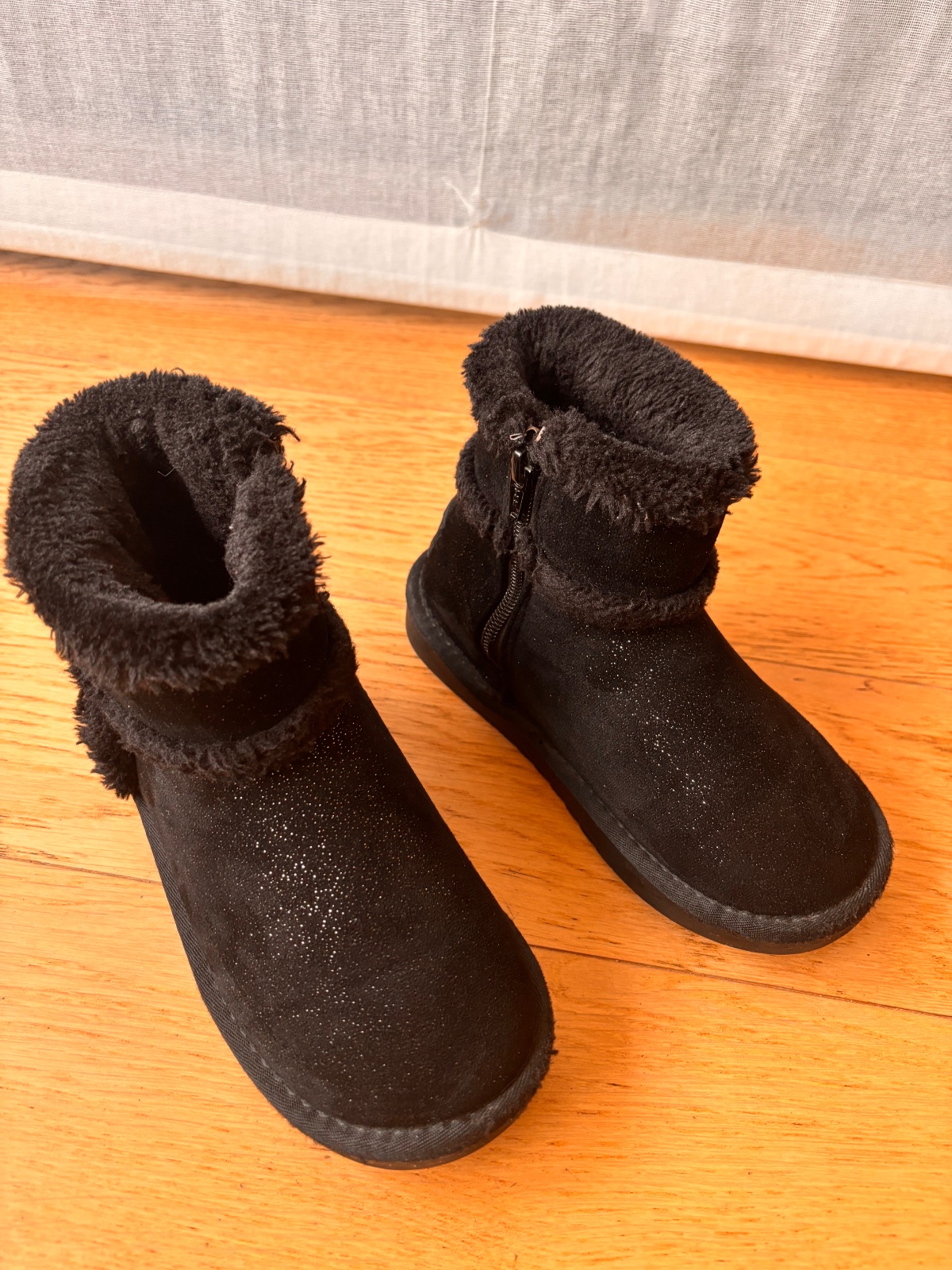 Zimné teplé čižmičky pre malú parádnicu v super stave, vhodné k šatom aj nohaviciam, teplé, pekne kožušinka obopne nôžku. Taký Ugg štýl, sú čierne trblietavé.