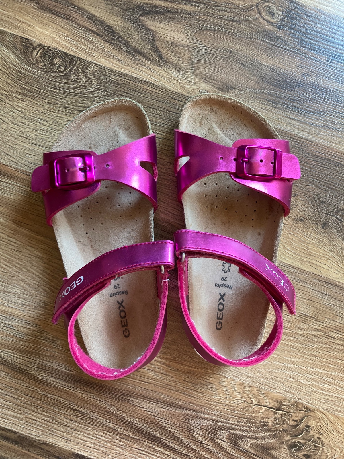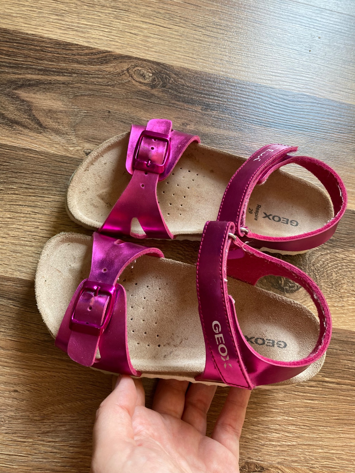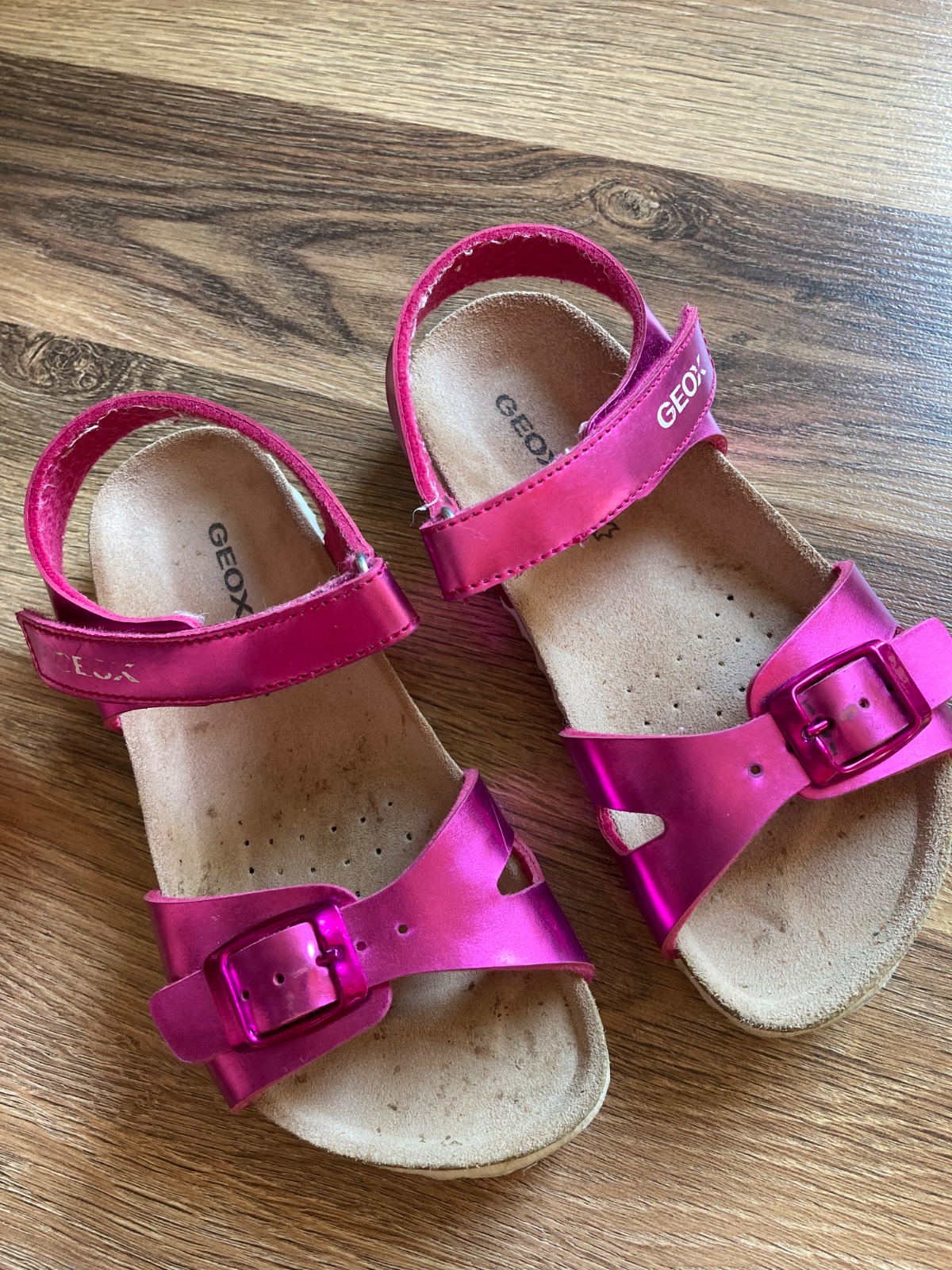 Ponúkam ľahučké, purpurové Geox sandále s klenbou. Veľkosť 29, VD celková asi 18,5cm, ja by som povedala, že na nôžku max 18cm. Pri tomto type sandálok - “drevákoch” sa mi to ťažšie meria. U nás boli málo nosené, vyrástla noha, ale podarilo sa aj tak zošúchať nápis značky a kde tu ich šuchnúť. Nájdu sa aj nejaké špinky na koženej časti. Celkovo sú však veľmi dobrý stav, aj na pohľad.