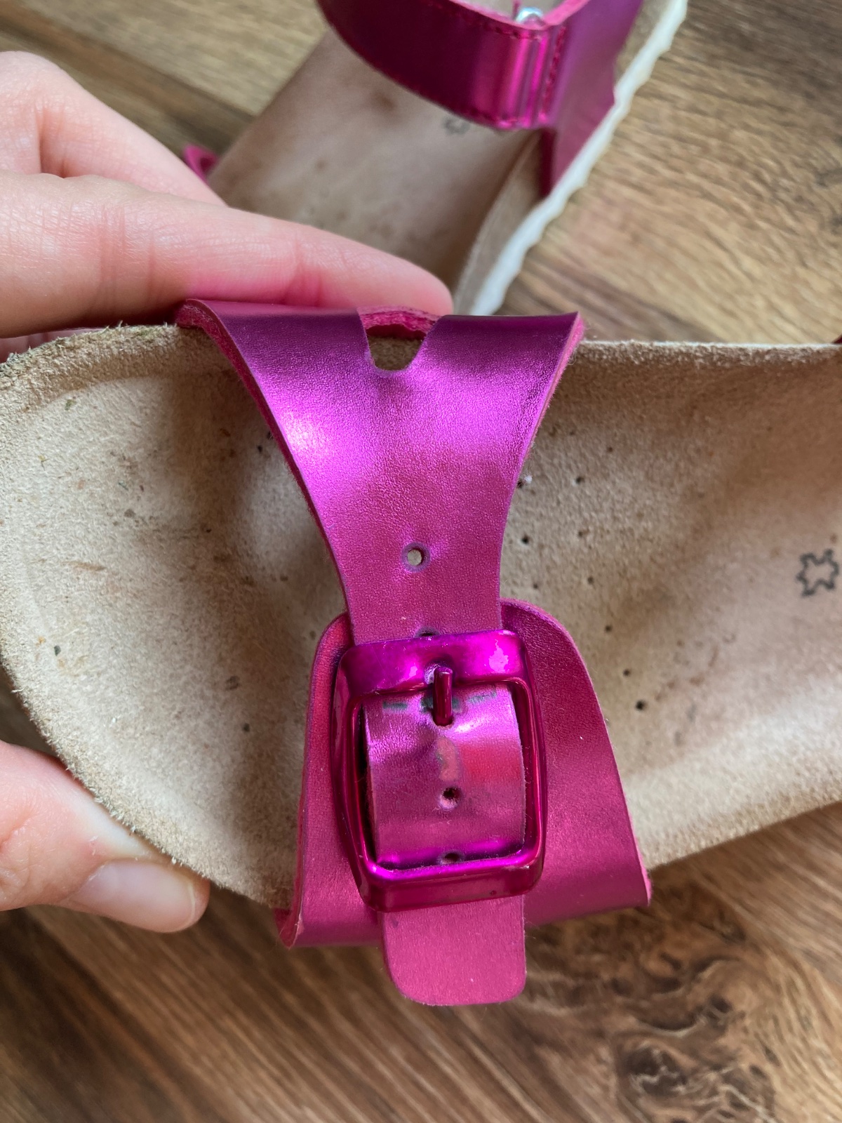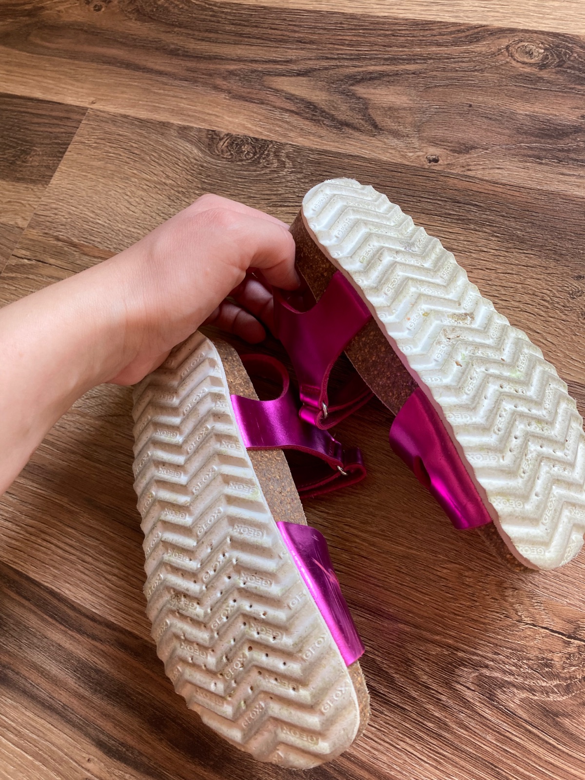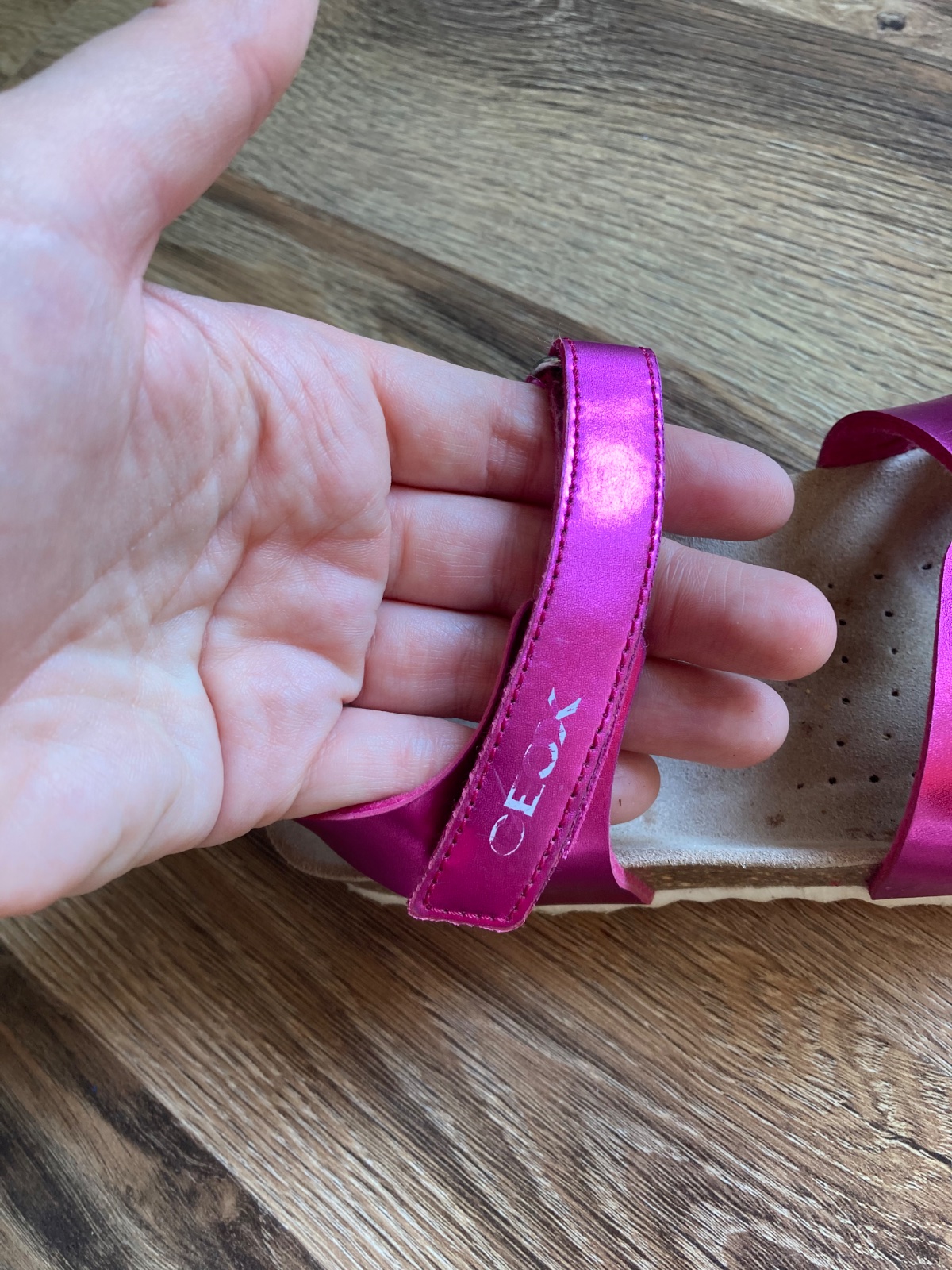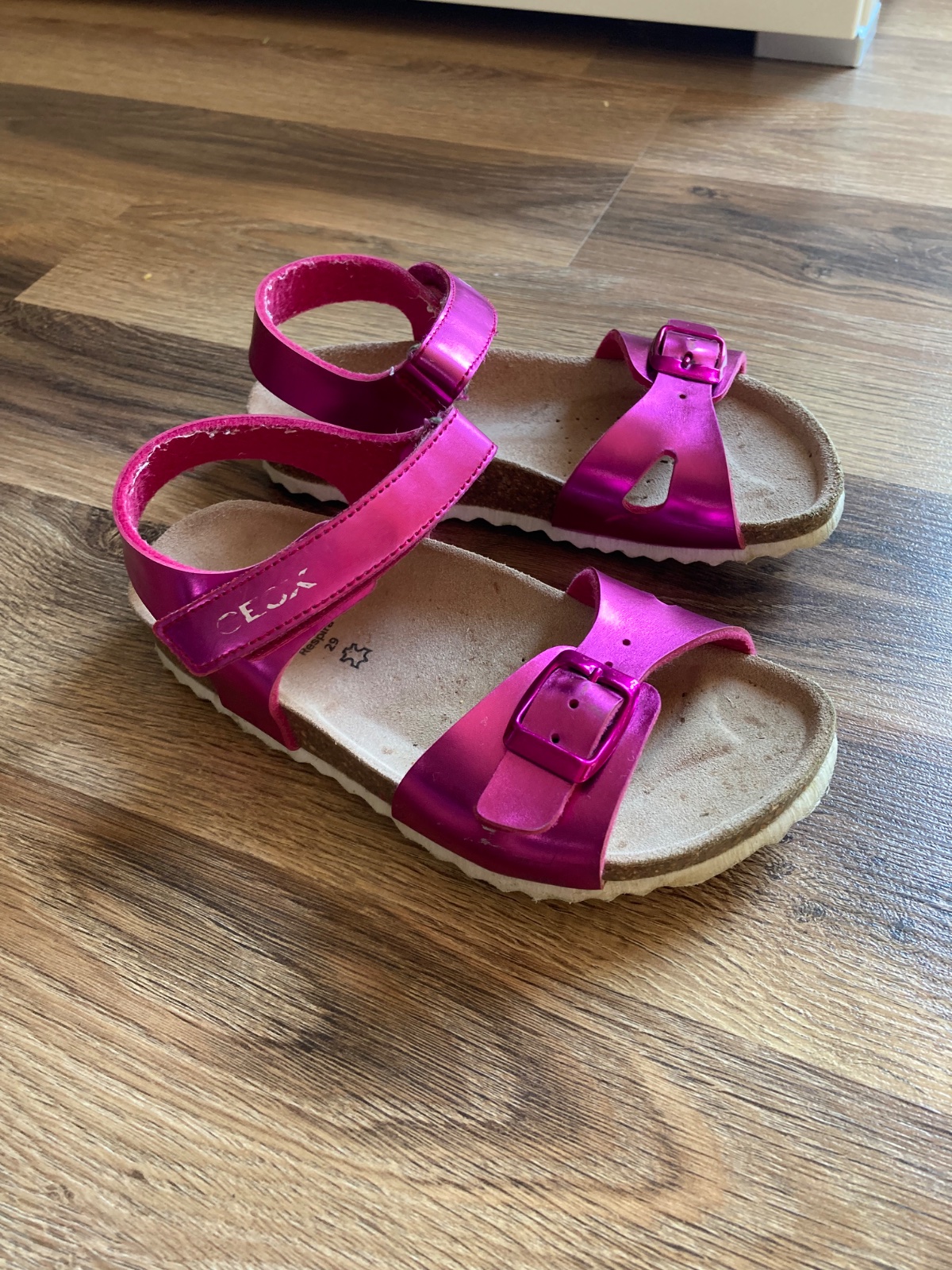 Ponúkam ľahučké, purpurové Geox sandále s klenbou. Veľkosť 29, VD celková asi 18,5cm, ja by som povedala, že na nôžku max 18cm. Pri tomto type sandálok - “drevákoch” sa mi to ťažšie meria. U nás boli málo nosené, vyrástla noha, ale podarilo sa aj tak zošúchať nápis značky a kde tu ich šuchnúť. Nájdu sa aj nejaké špinky na koženej časti. Celkovo sú však veľmi dobrý stav, aj na pohľad.