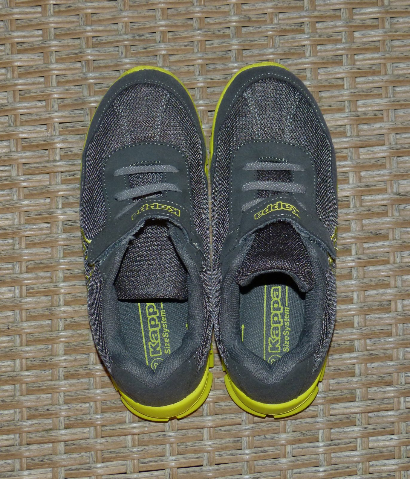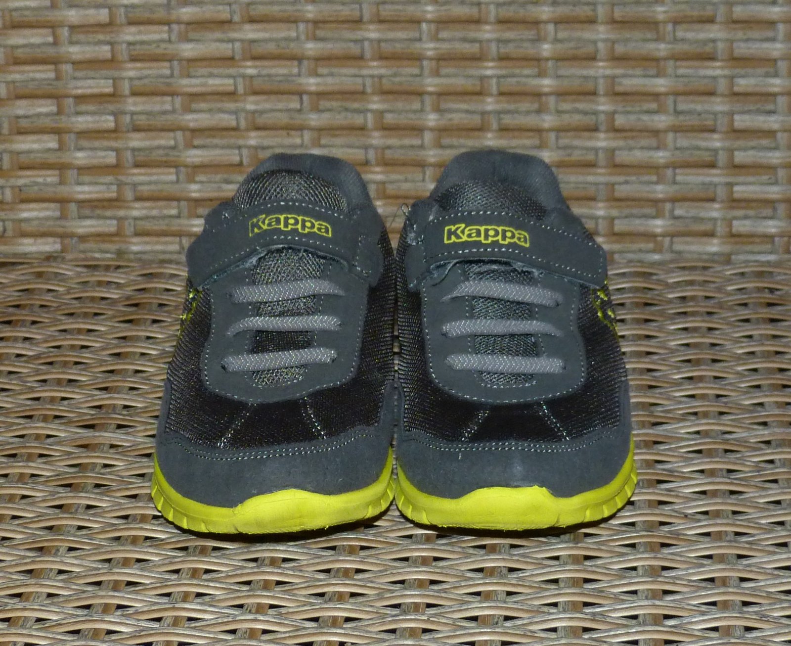 Tmavosivé tenisky Kappa, v perfektnom stave, bez poškodení a známok nosenia, použité iba v interiéri, takmer ako nové, s kontrastnou neónovo zelenou podrážkou, ľahučké tenisky, ľahké obúvanie