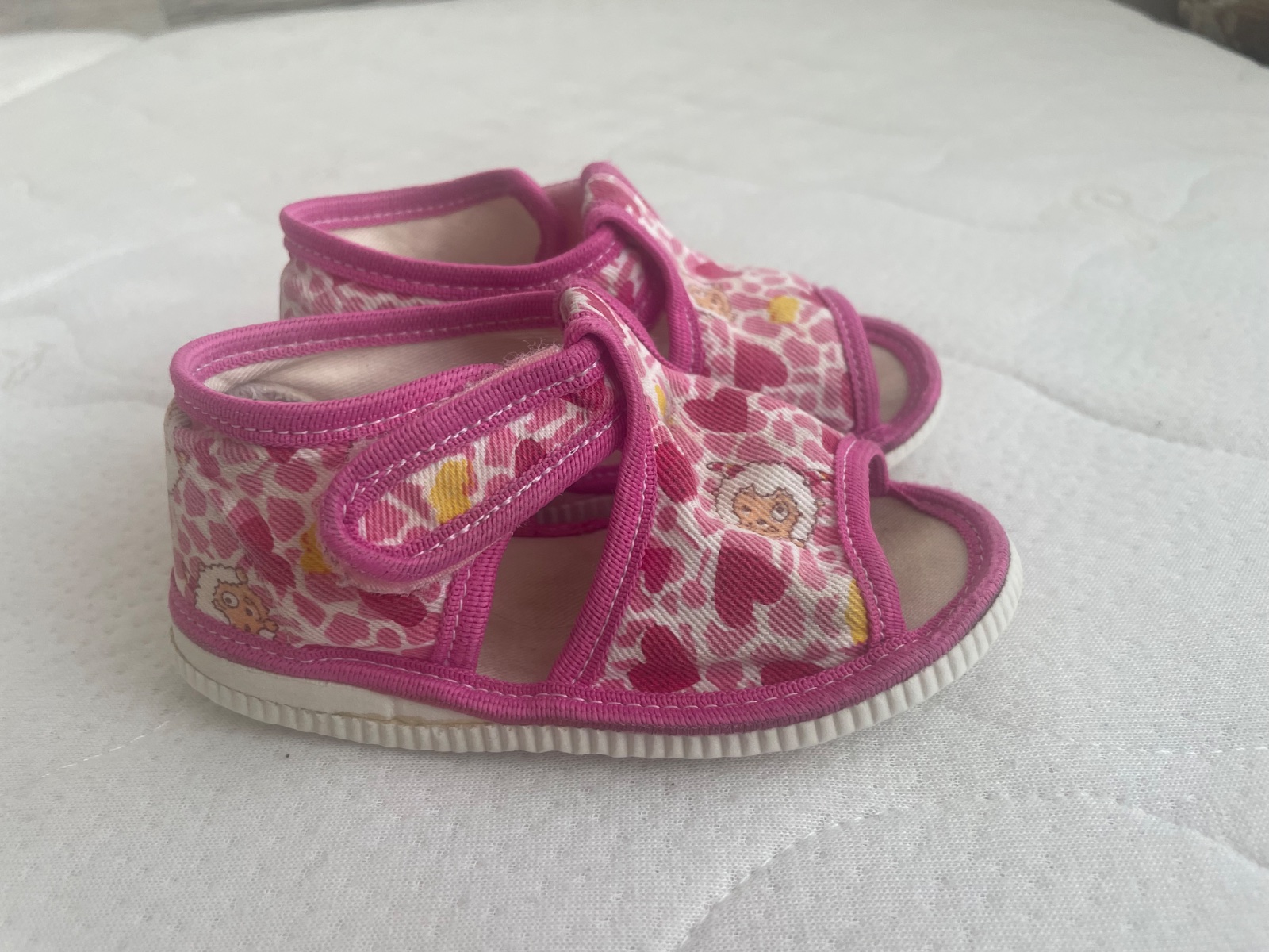 Posuvam papucky slovenskej znacky Manik. V dobrom stave, bez poskodenia, lahko sa obuvaju. Nosene asi dva mesiace, potom sme uz potrebovali vacsie. VD 13 cm