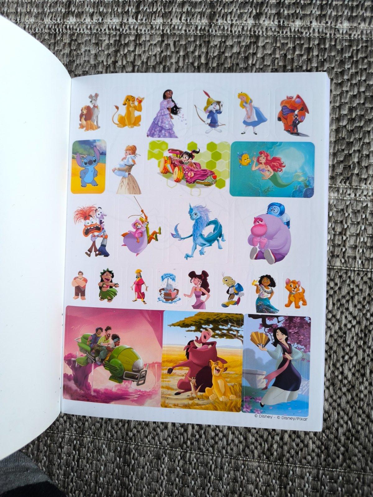 Kniha omaľovánok a nálepiek Disney má len jednu vymaľovanú stranu, zvyšok nepopísaný, aj nálepky sú komplet. .