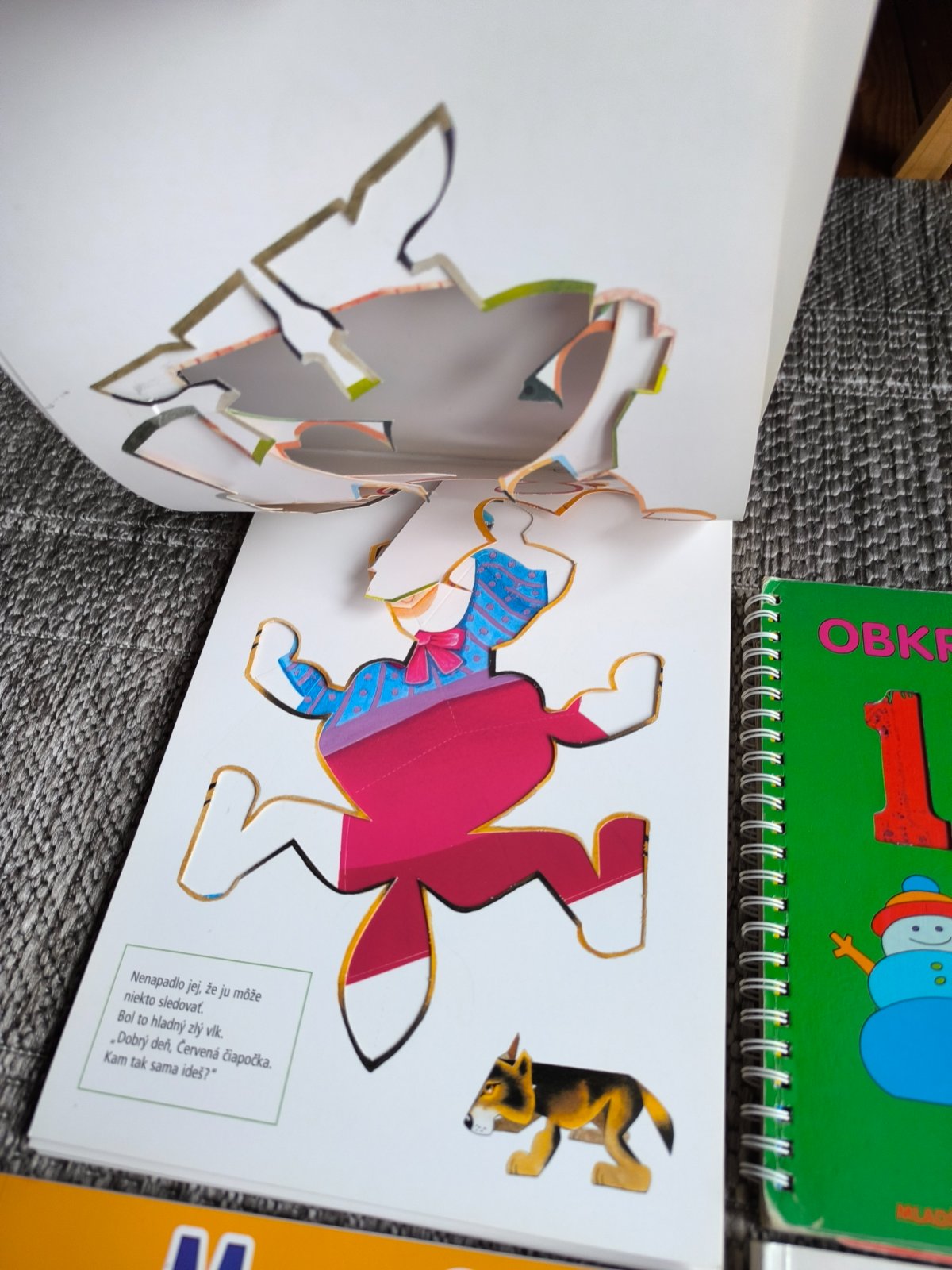 Knižka Rozprávkové skladačky obsahuje šablóny na postavičky zo známych rozprávok. Prvé štyri sú prázdne, už ich deti vylúpli a hrali sa s nimi, ale zvyšok knihy je neporušený.