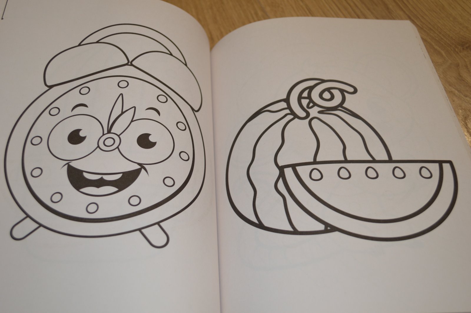 Vymaľovánky, pár strán je vymaľovaných, hrubá knižka