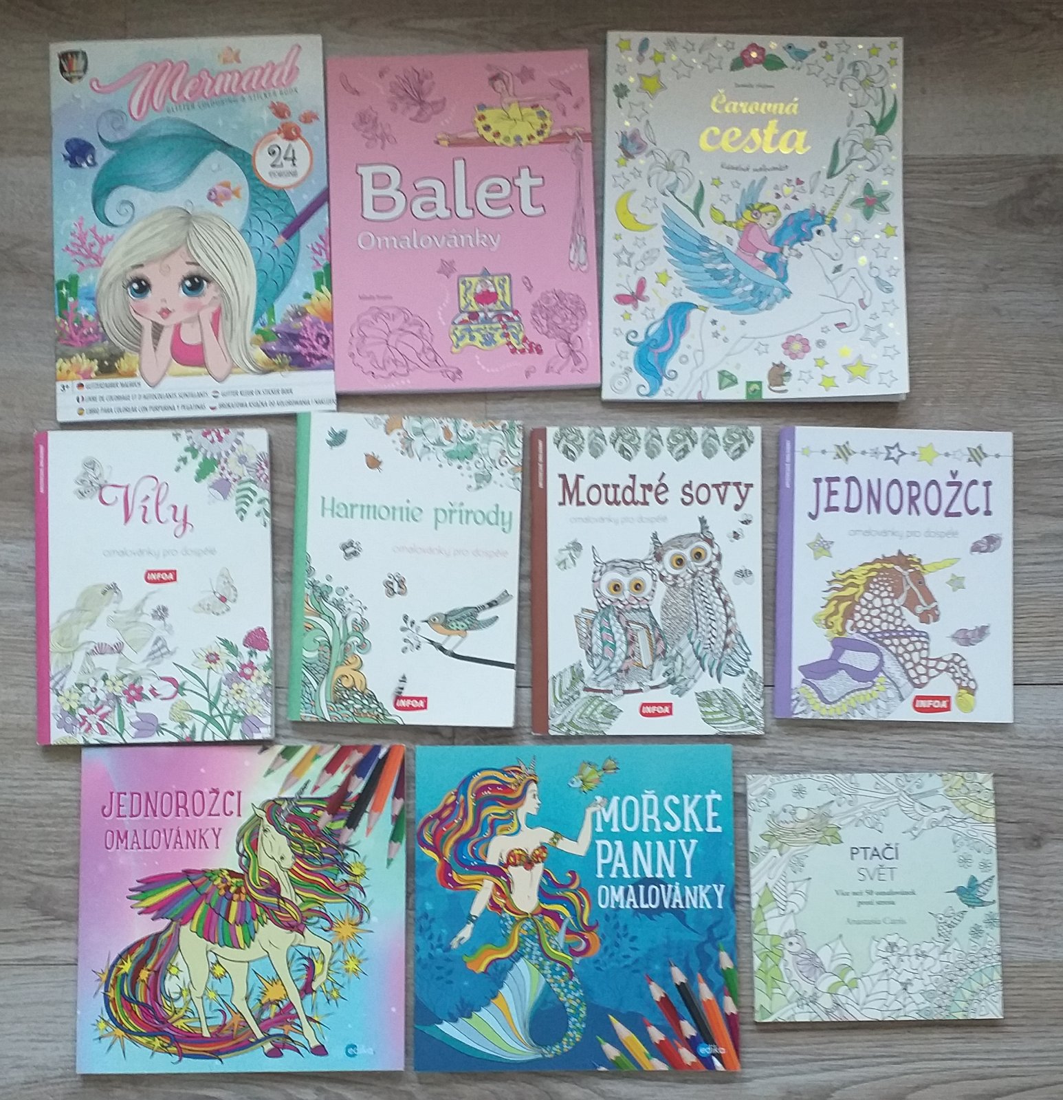 Stredný rad: Moudré sovy nová 60 strán 4 eur, Jednorožci nová 60 strán 4 eur.