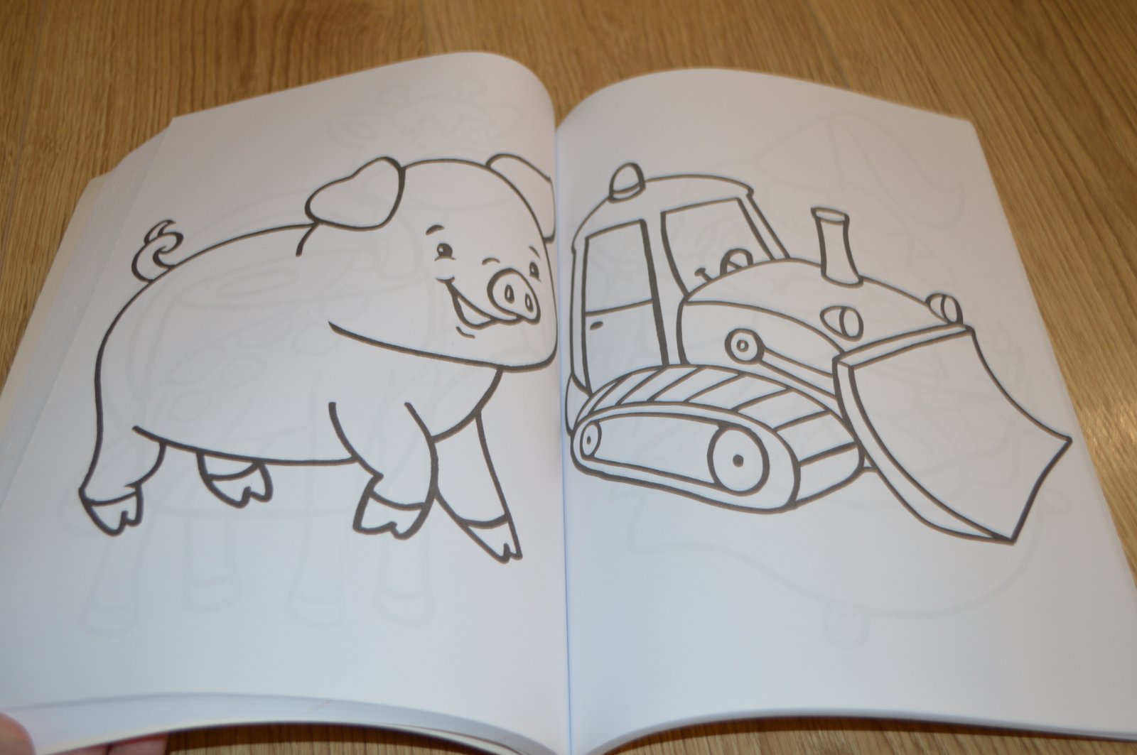 Omaľovánky pre najmenšie deti, pár strán je už vymaľovaných, hrubá knižka