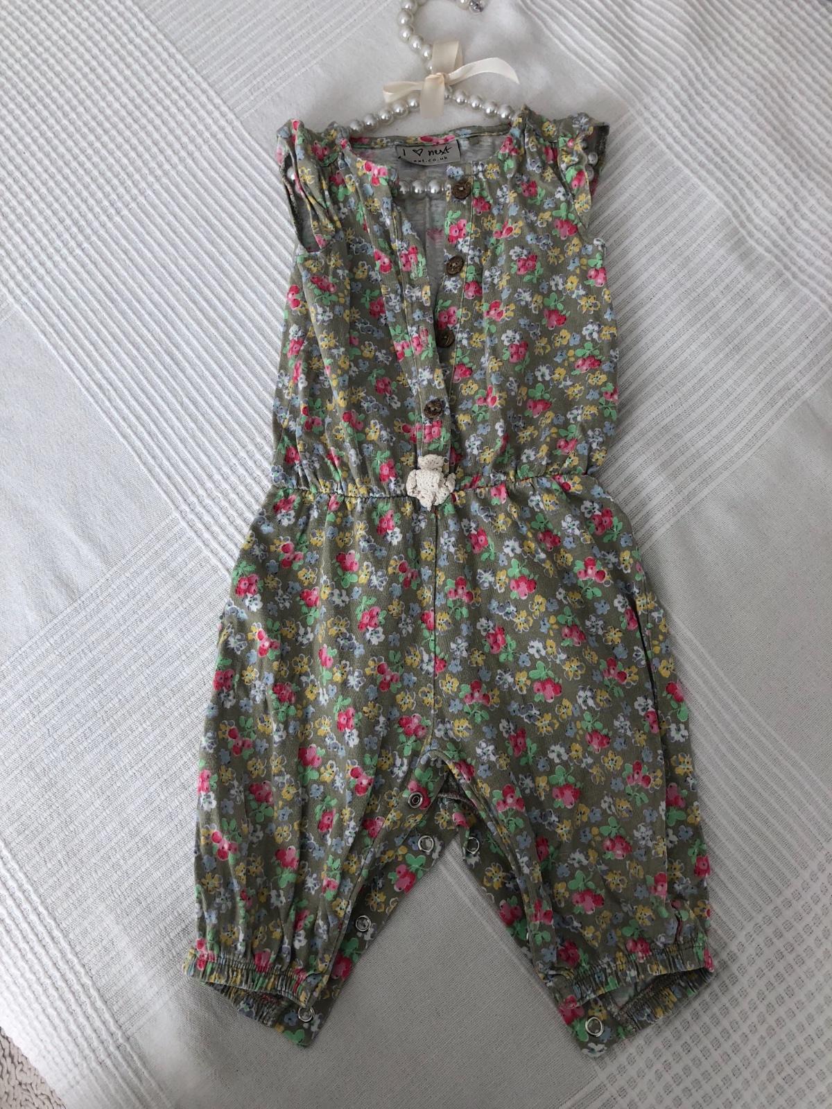 Nádherný overal na leto, krásne farby, ľahučký, pohodlný, nosený dvomi deťmi, bez poškodení, veľmi pekný stav, píšu 68, ale v pohode aj ako 74.