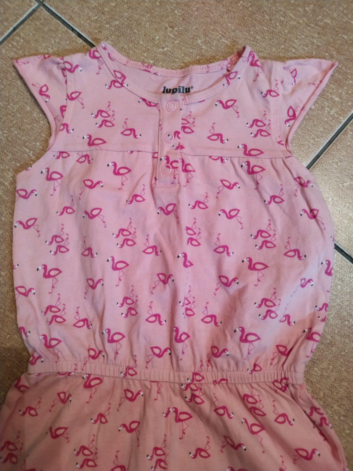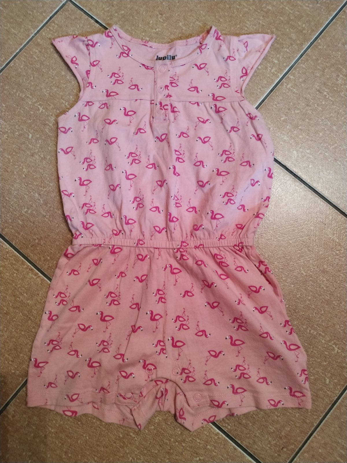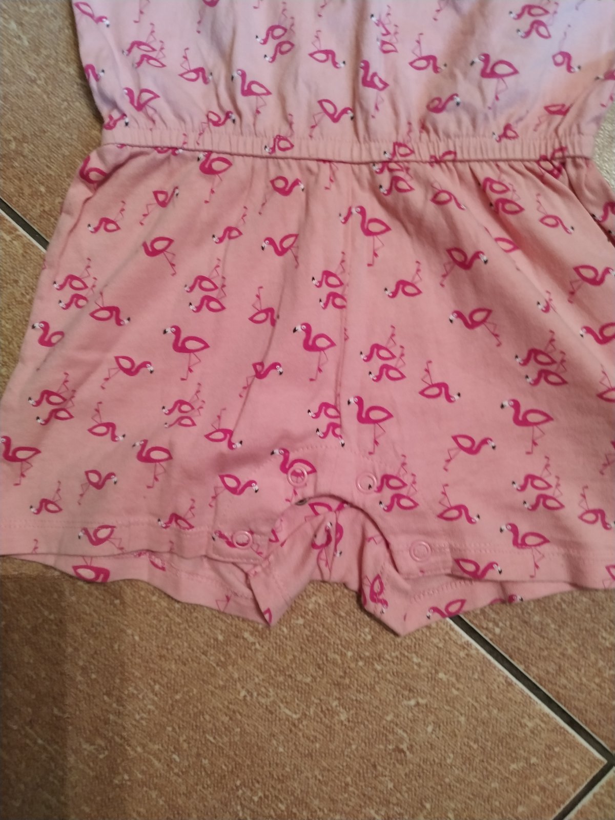 Praktický letný overal s plameniakmi. V páse na gumičku, zapínanie vpredu na 3 cvoky a cvoky sú aj dole (zo spodu).