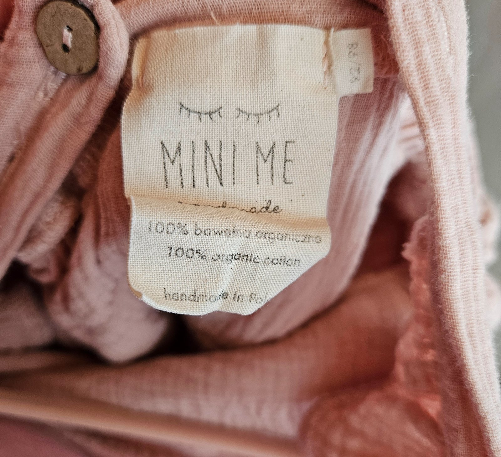 Krásny kúsok, vo veľmi dobrom stave. Príjemný materiál. Traky majú po dva gombíky. Zapínanie medzi nohami na gombíky. Vzadu sa dá uviazat mašľa. V páse je guma. Farba je niečo medzi staroružovou a svetlo hnedou, najviac sa podoba na poslednej fotke. Neviem zachytiť na fotku. Veľkosť 86/92. PC 40€