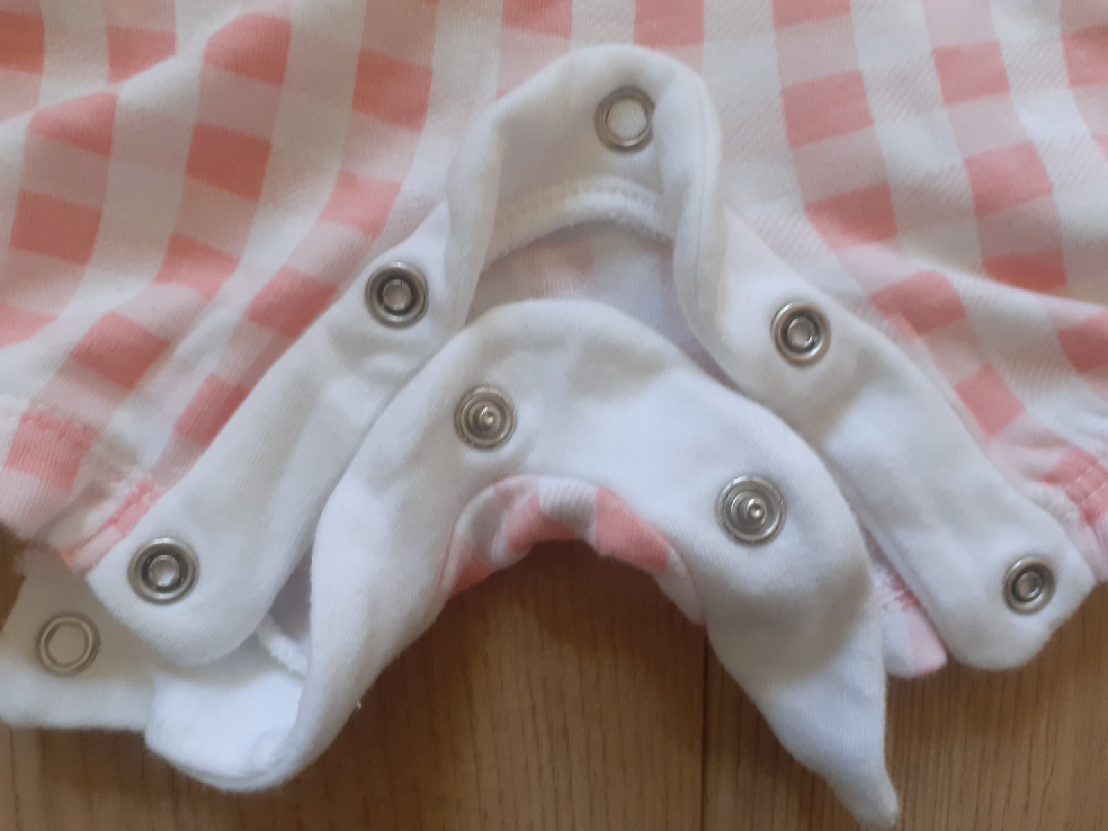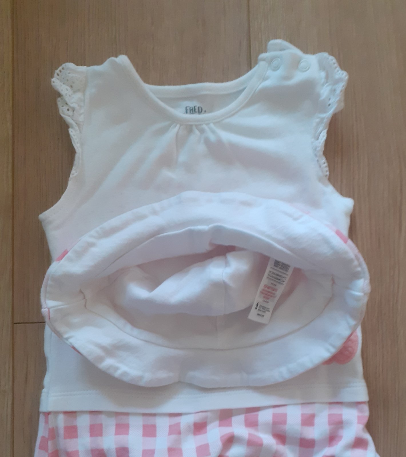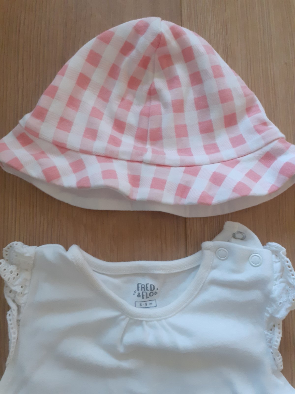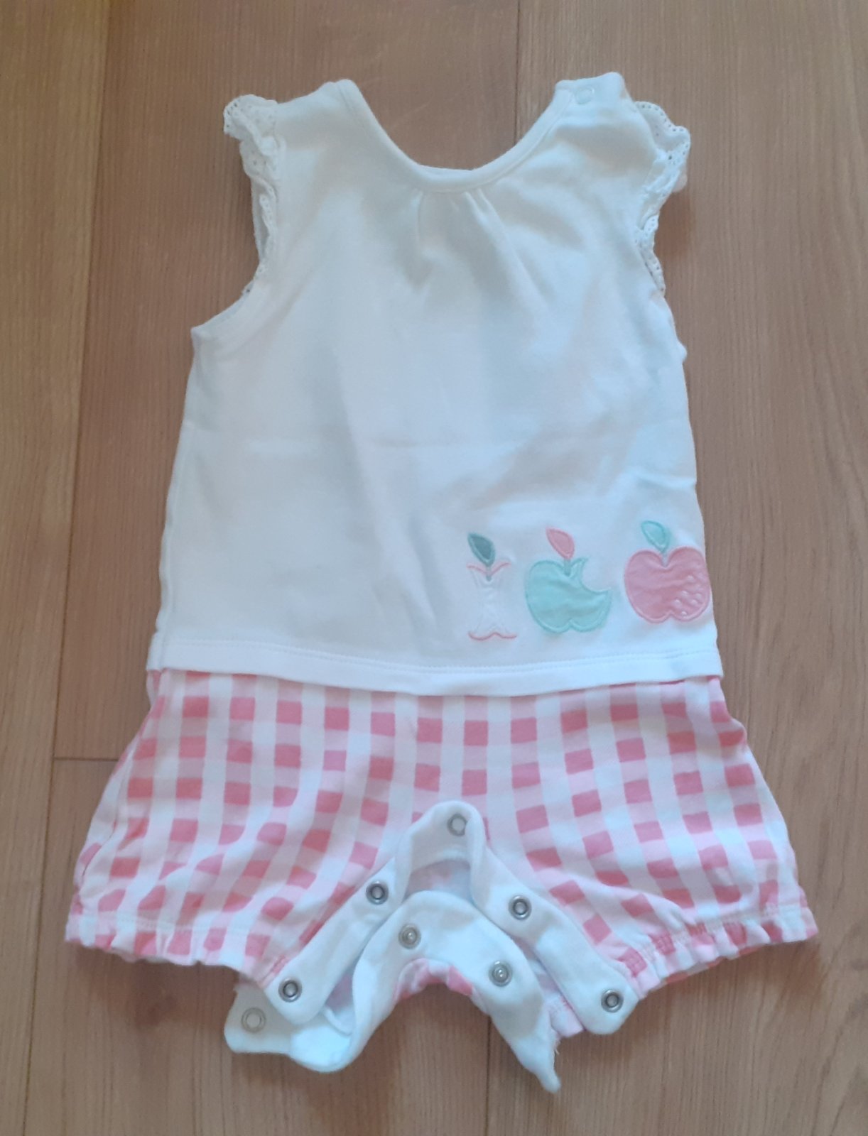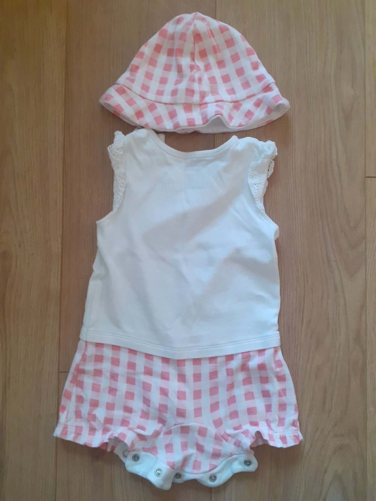 Hádam raz oblečené opaľovačky / letné body bez rukávov v bielo-bledučko-červenej kombinácii, zapínanie na cvočky, v bezchybnom stave, ako nové, klobúčik sme nepoužili vôbec.