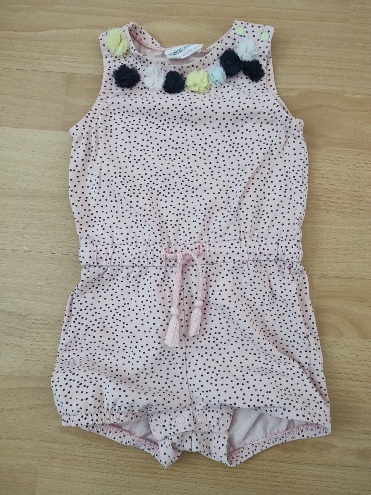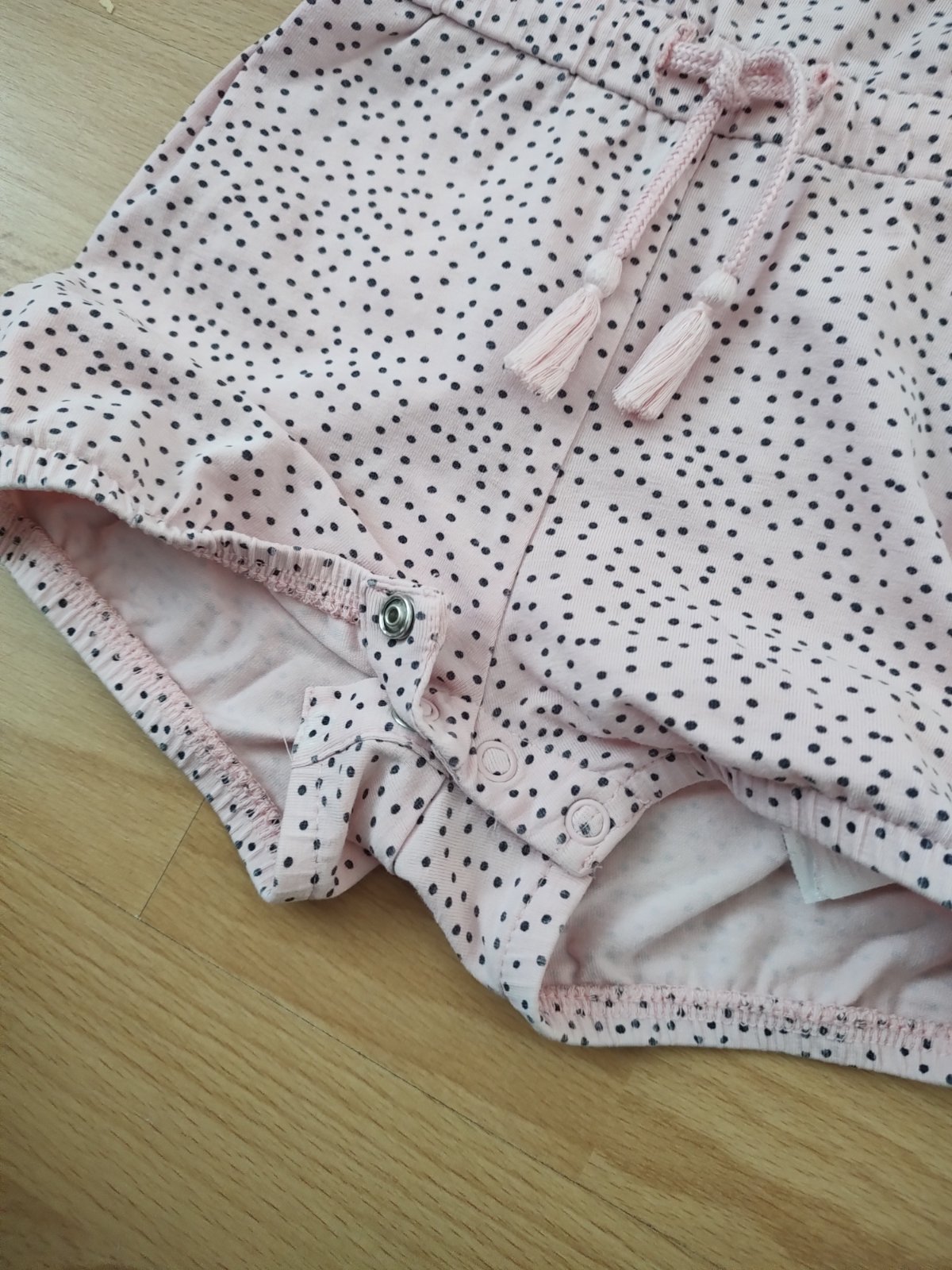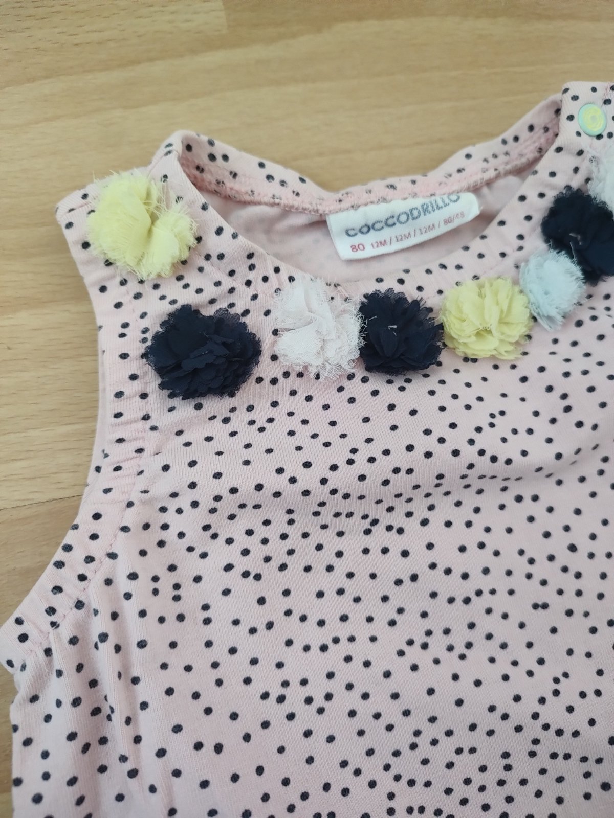 Ľahký letný overal, vzdušný, príjemný materiál. Dole jeden cvok odtrhnutý, no overal drží stále, je funkčný.