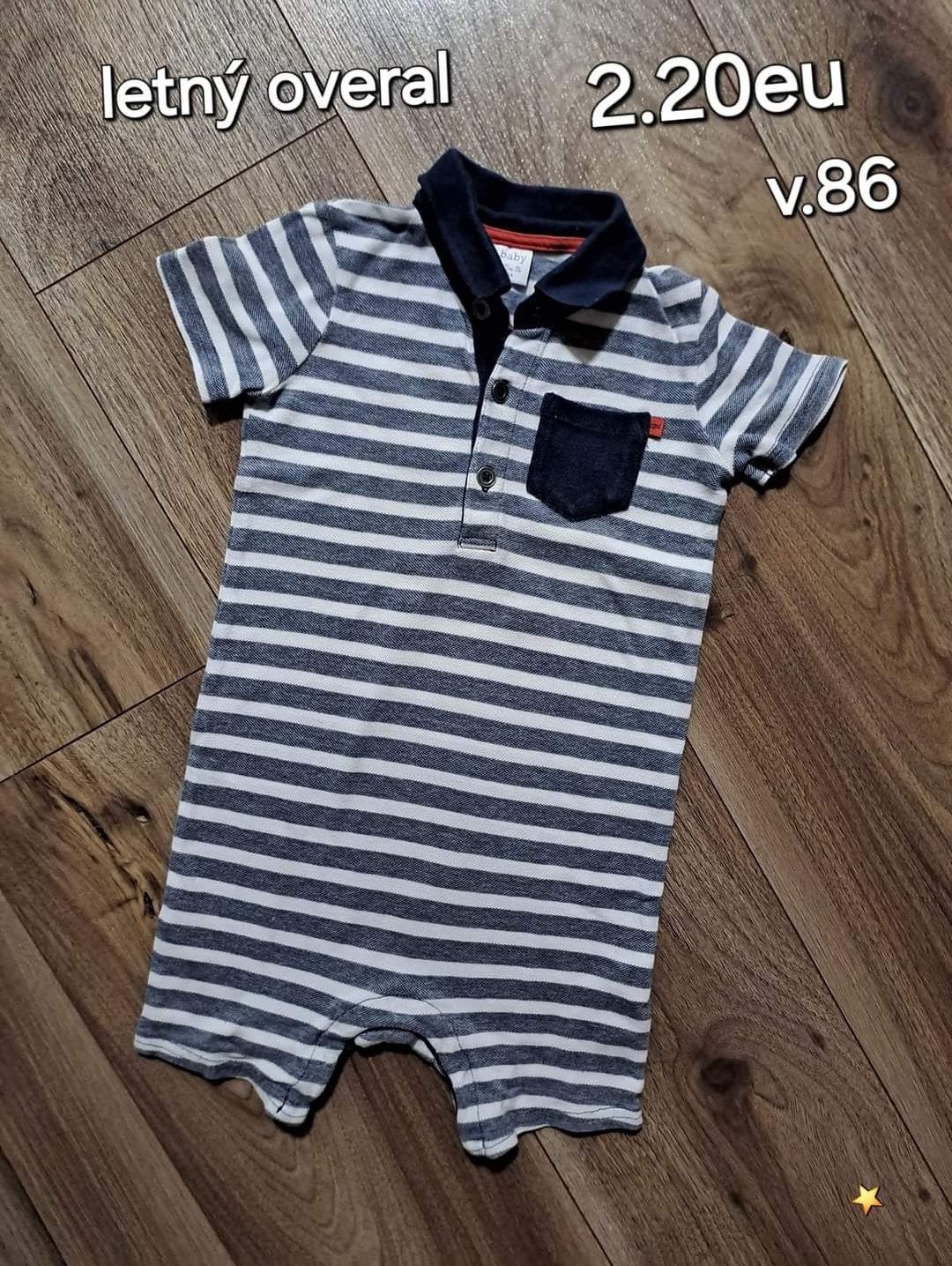 Chlapčenský komplet na leto, veľkosť odhadujem tak 86, uvedené je 100 asi na výšku 100 cm, premeriam, zapínanie na cvoky a gombíky pozdĺž overaliku, cvoky medzi nohami pre ľahké prebaľovanie, je vc...