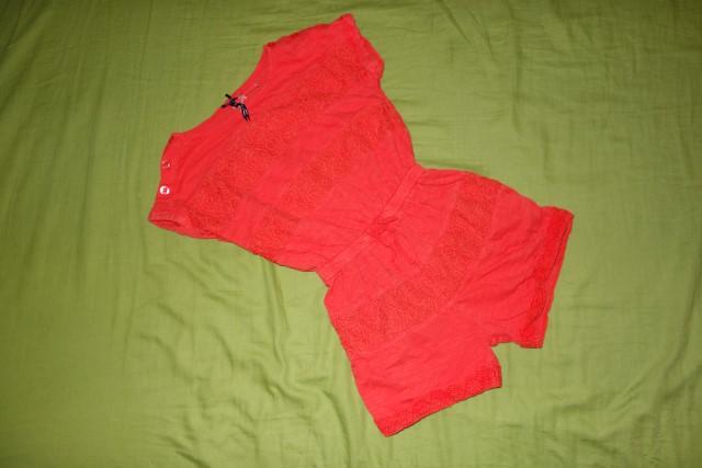 Pekny upletovy overalcek vo velmi dobrom stave- ma ale pod maslickou na brusku malu dierku (vid foto). Je takej oranzovo-cervenej farby.