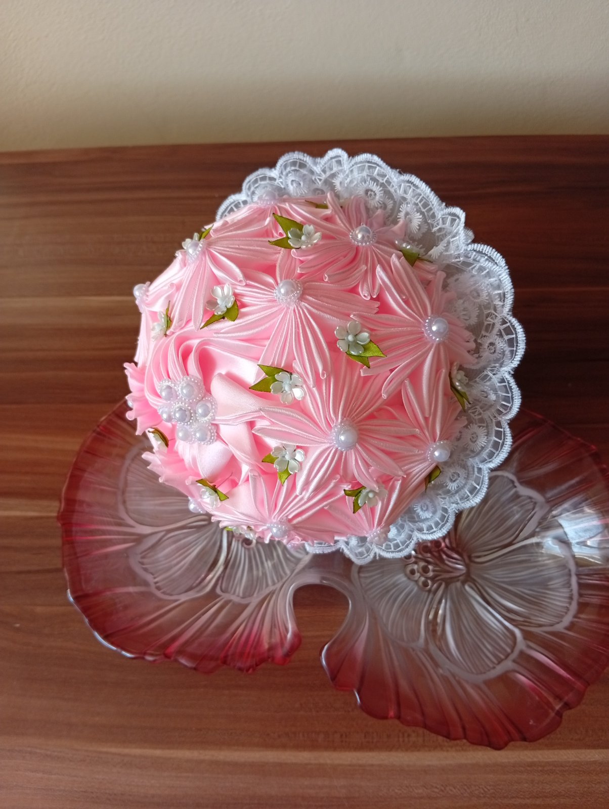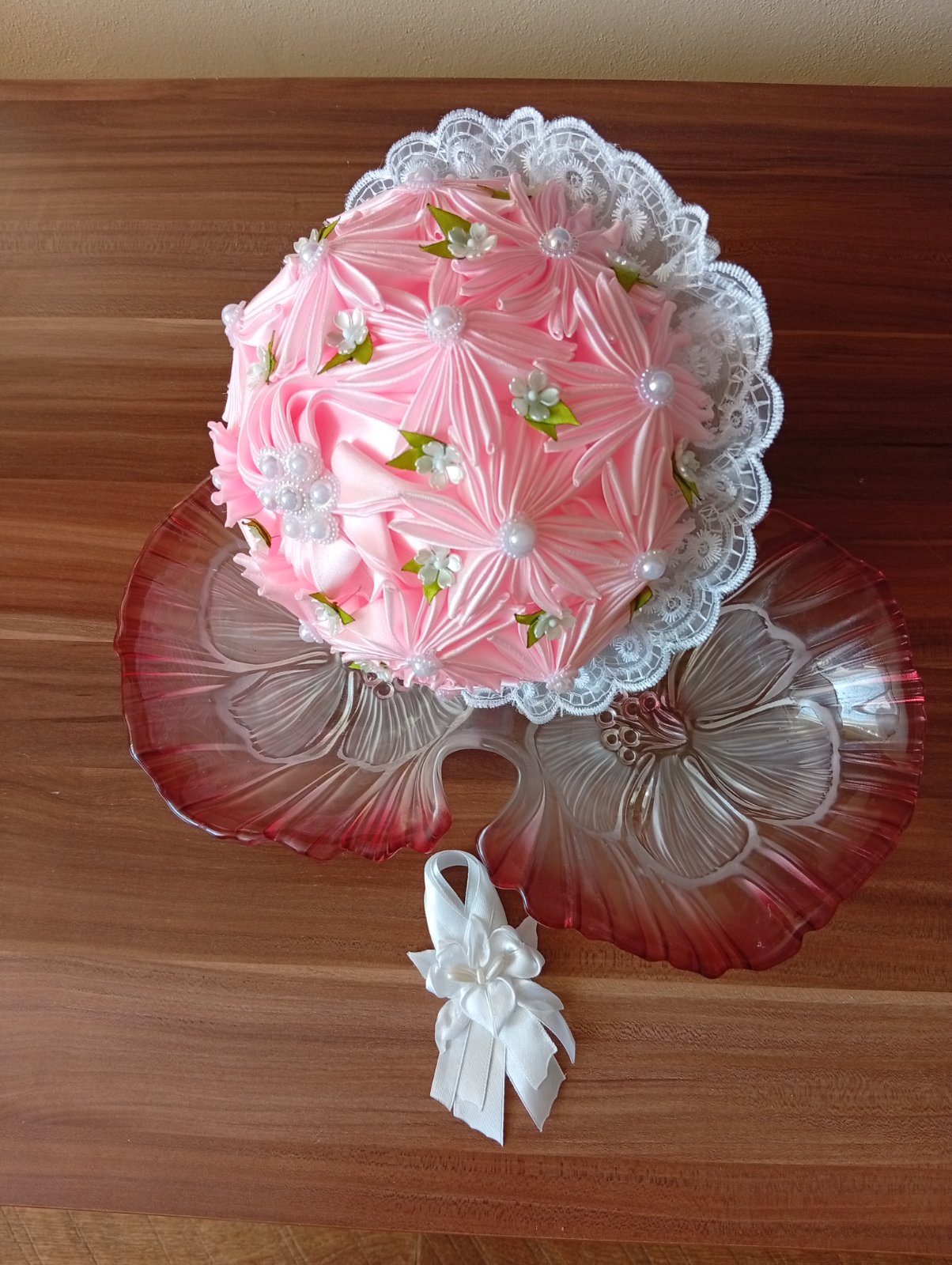 Ručné vyrobené zo satenovej stuhy ružičky a lístky. Výška 32 CM . Pierko pre ženícha. Kytica svadobná. Cena plus poštovné. Osobný odber.