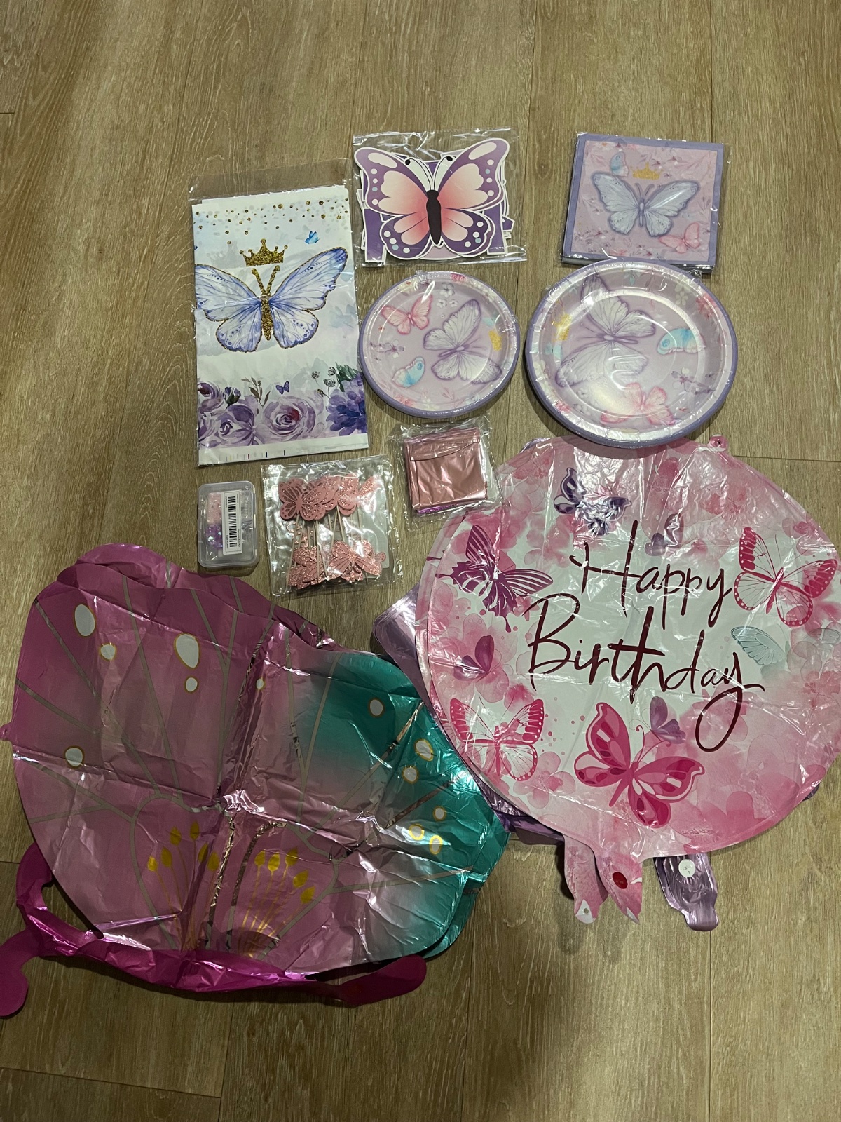Obsahuje:taniere,servitky,pohare,sviecku c.5,napis Happy birthday,balon velky motyl,baliny happy…,obrus,zapich na tortu a muffiny