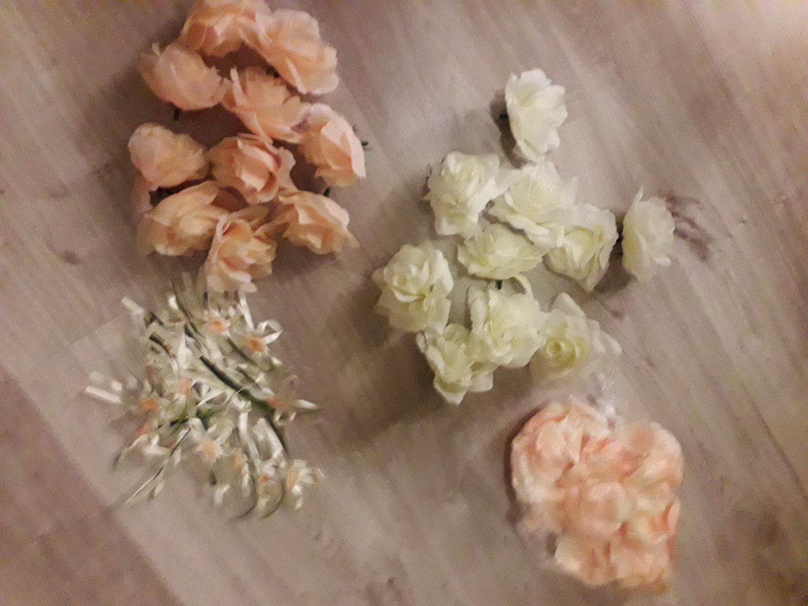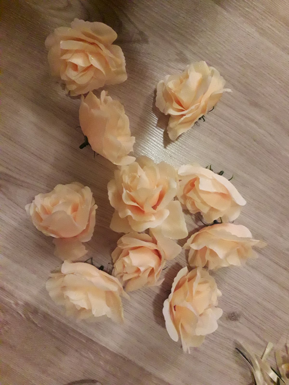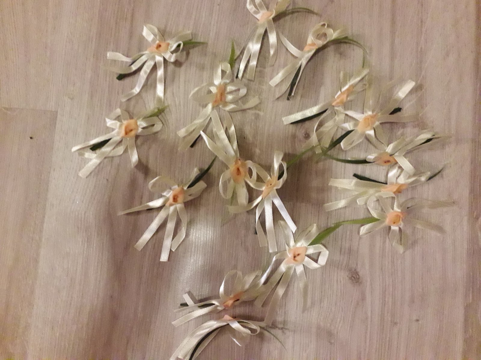 Predám svadobné pierka 16 ks - farba krémová mašľa, marhuľový kvet (spolu 1 €), 10 ks hlavičiek kvetov marhuľovej farby (1 €), 10 ks hlavičiek kvetov krémovej farby (1 €), 130 ks marhuľovokrémových lupeňov (1 €) - zostali mi nepoužité zo svadby. V prípade odberu všetkého - 3,5 € spolu
