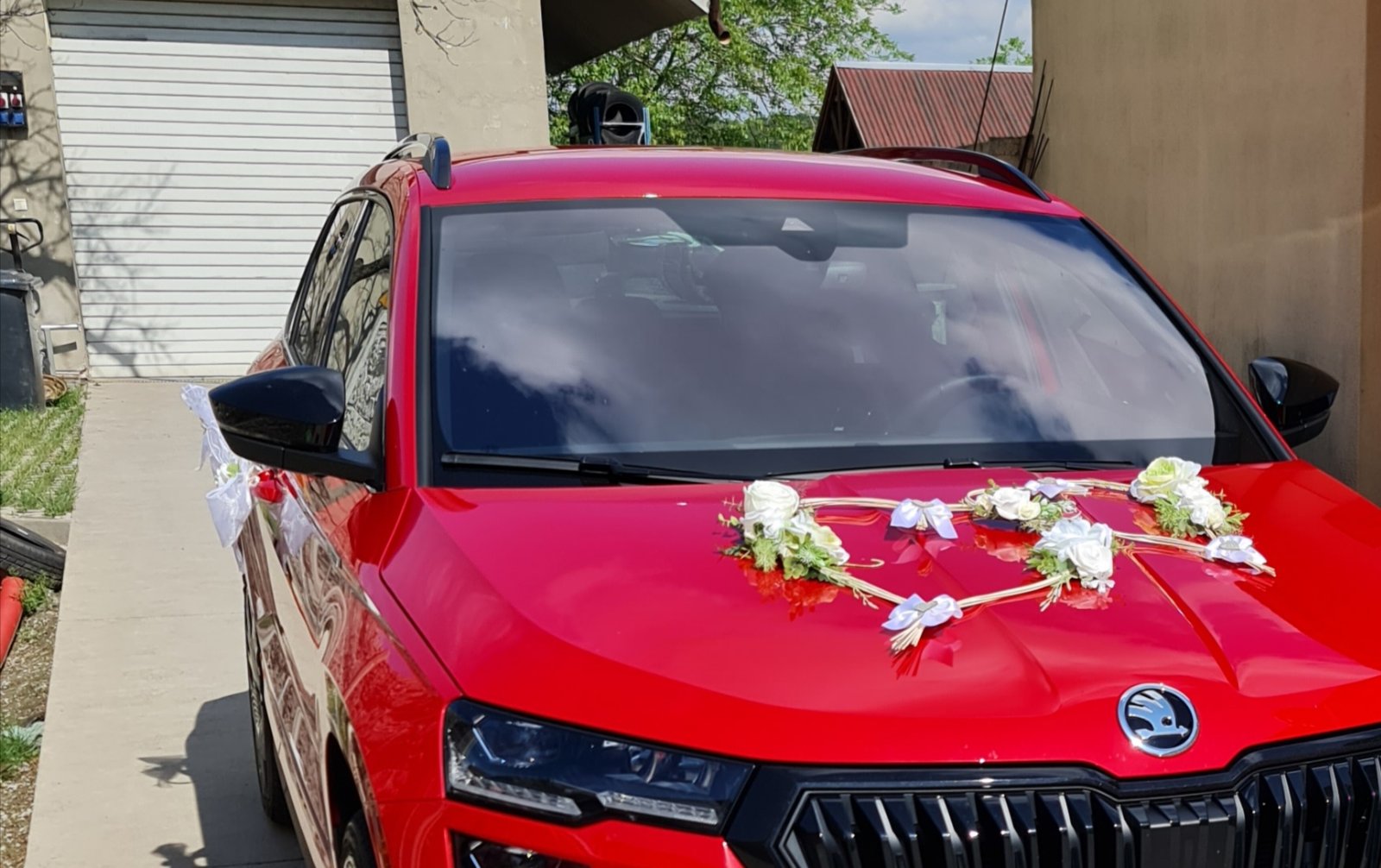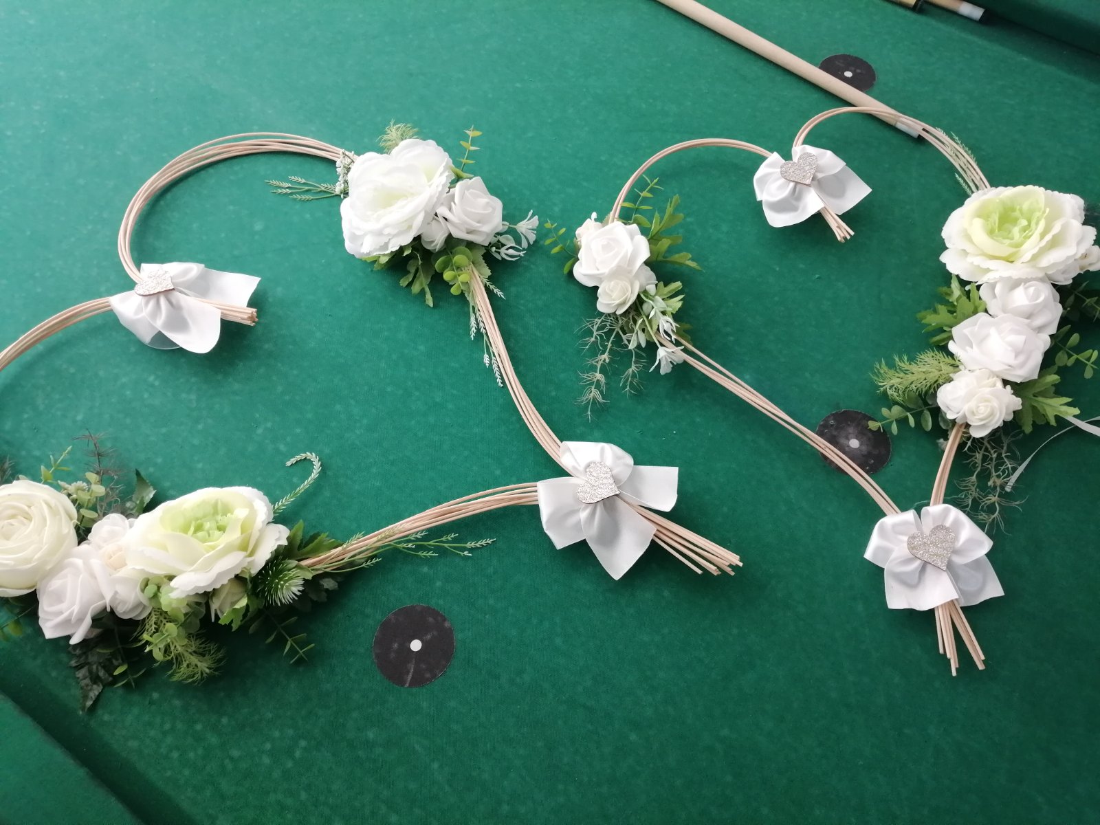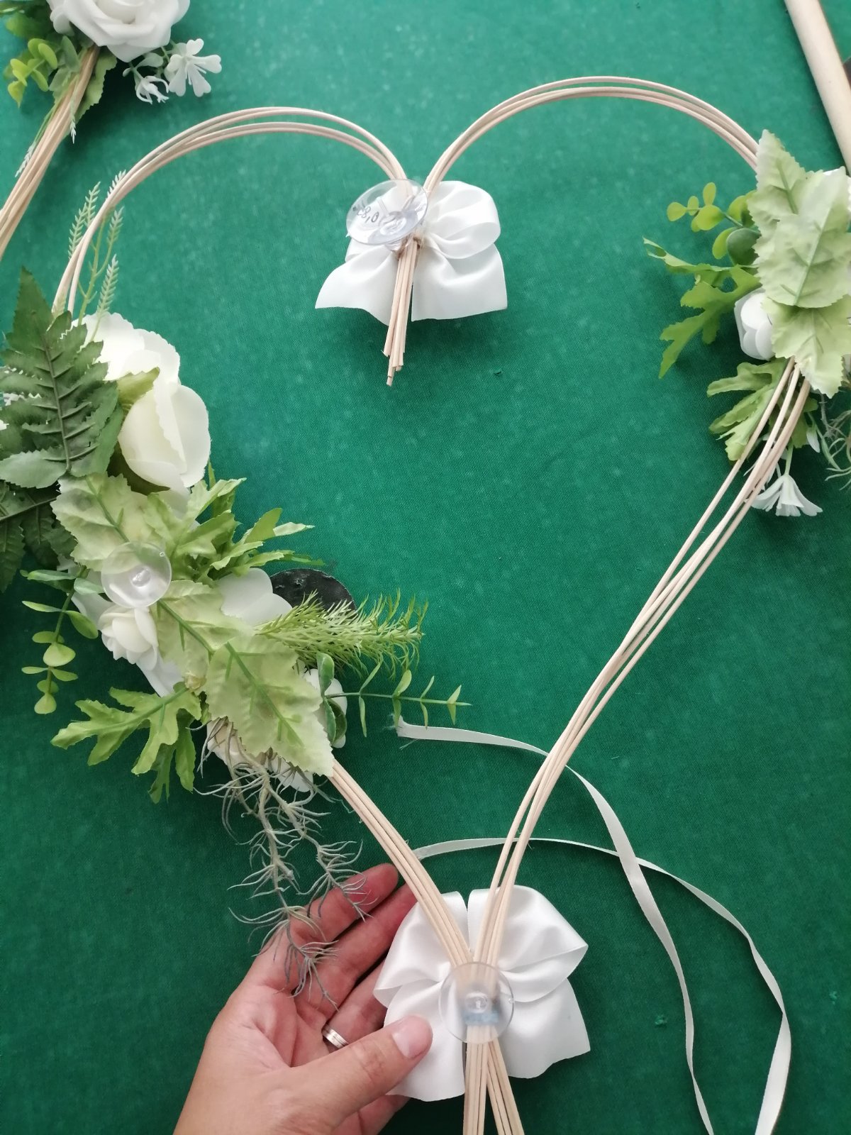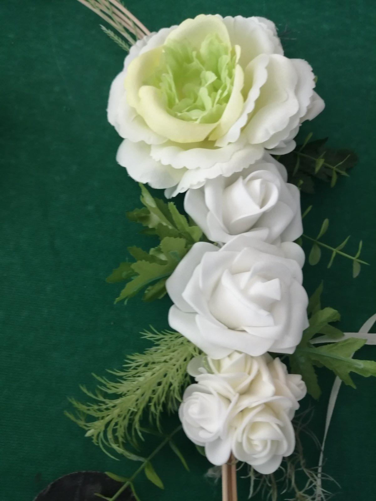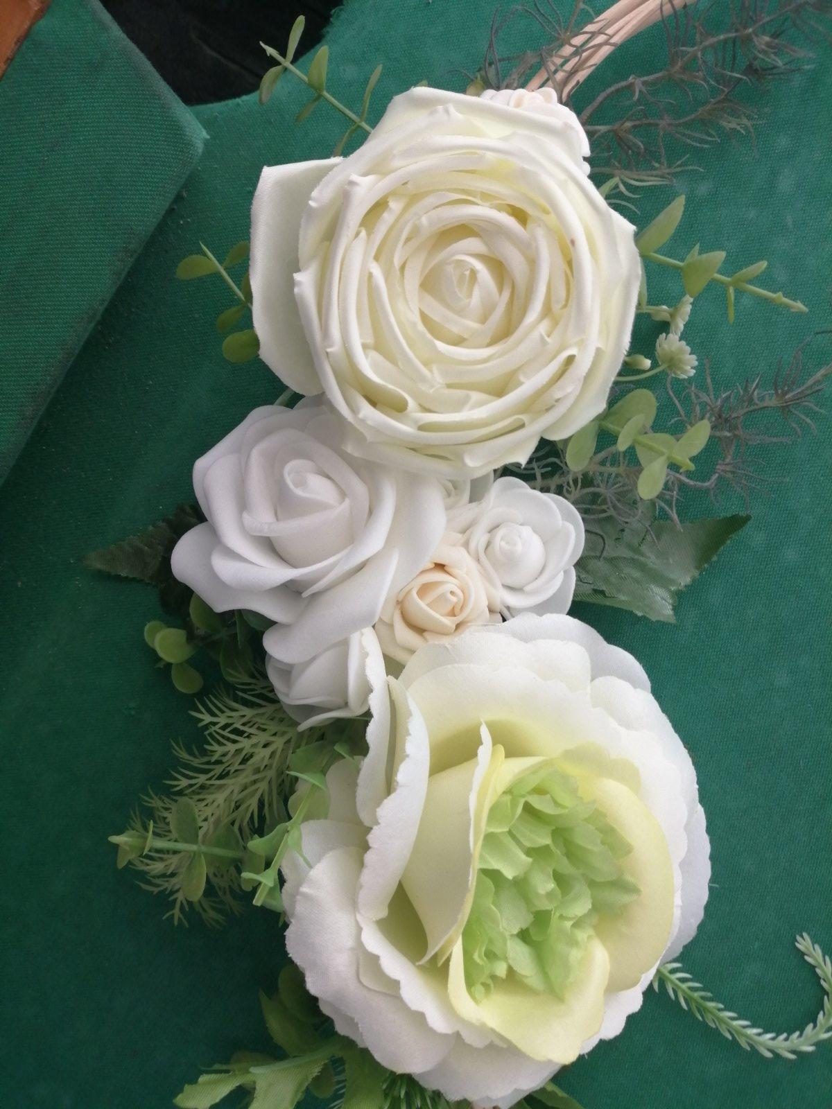 Svadobná výzdoba na auto robená na mieru, použitá len mnou, je bez chyby, obsahuje 2 srdiečka (s prisavkami) ružičky sú ladené do jemných farieb, biela, krémová zelenkasta, k cene si treba prirátať poštovné