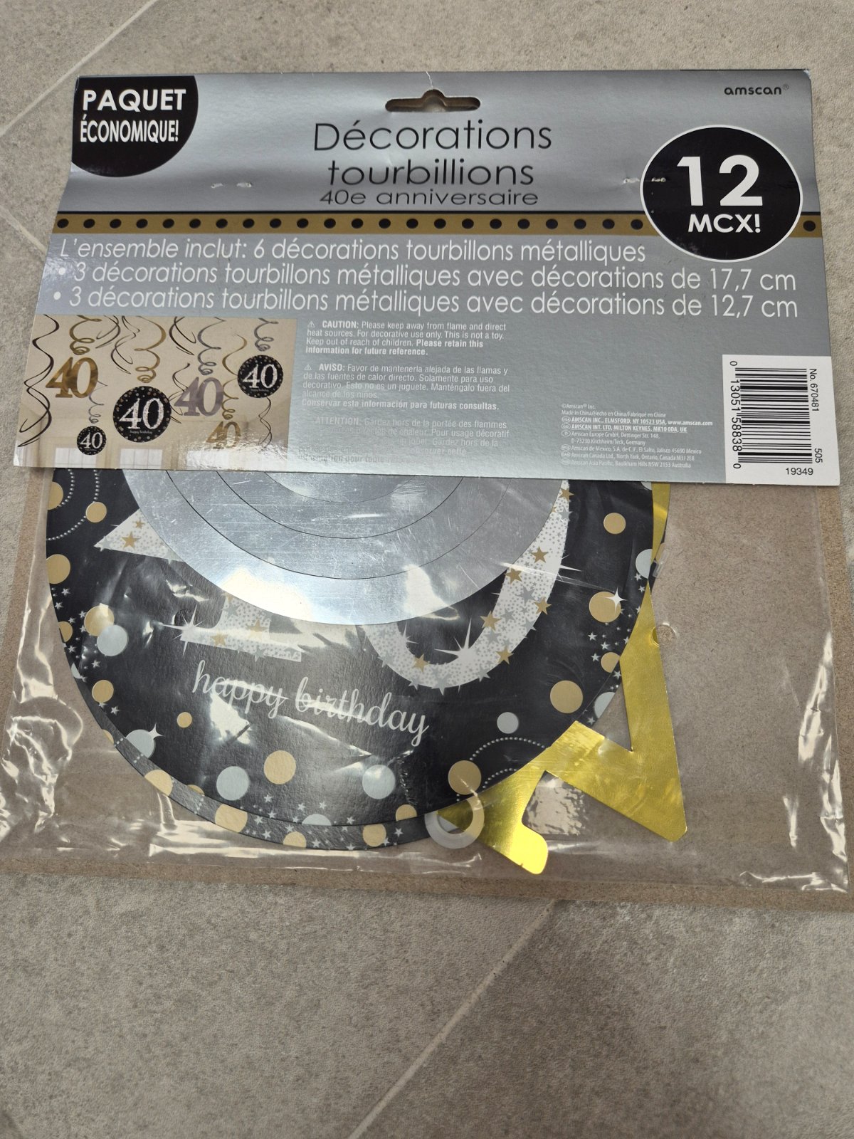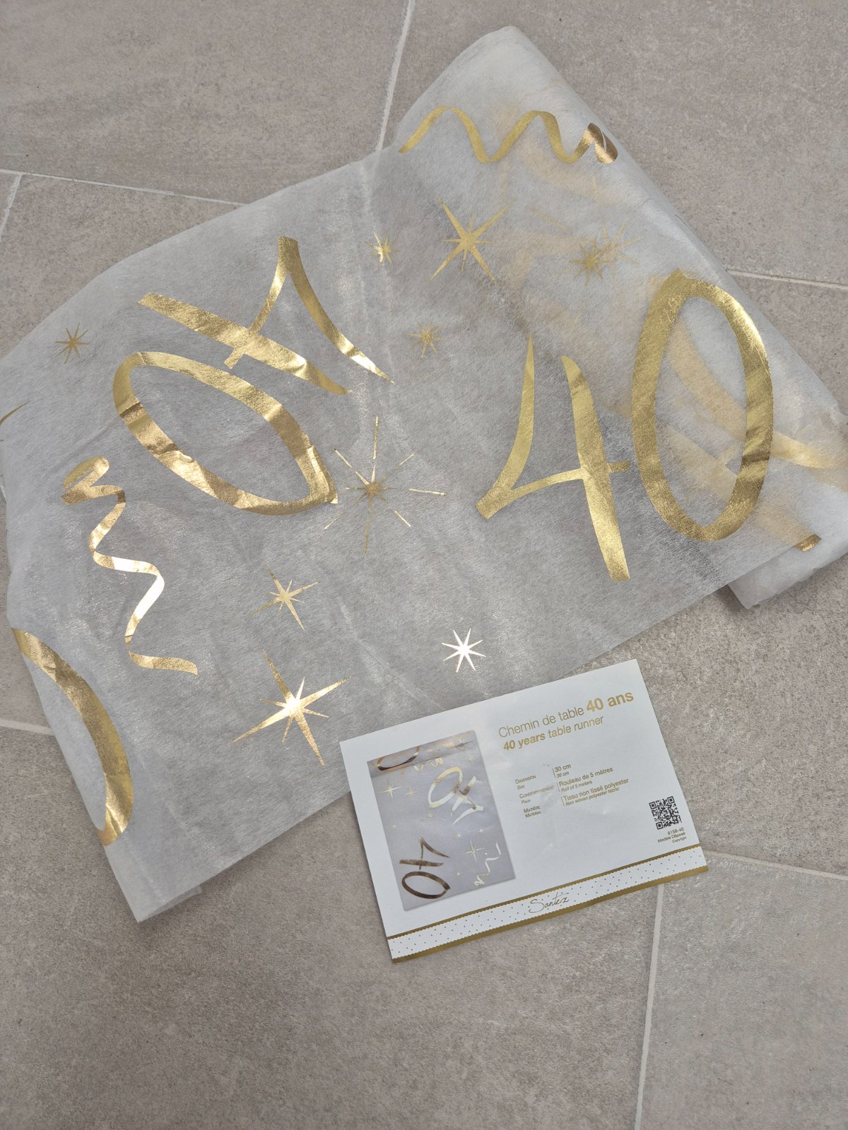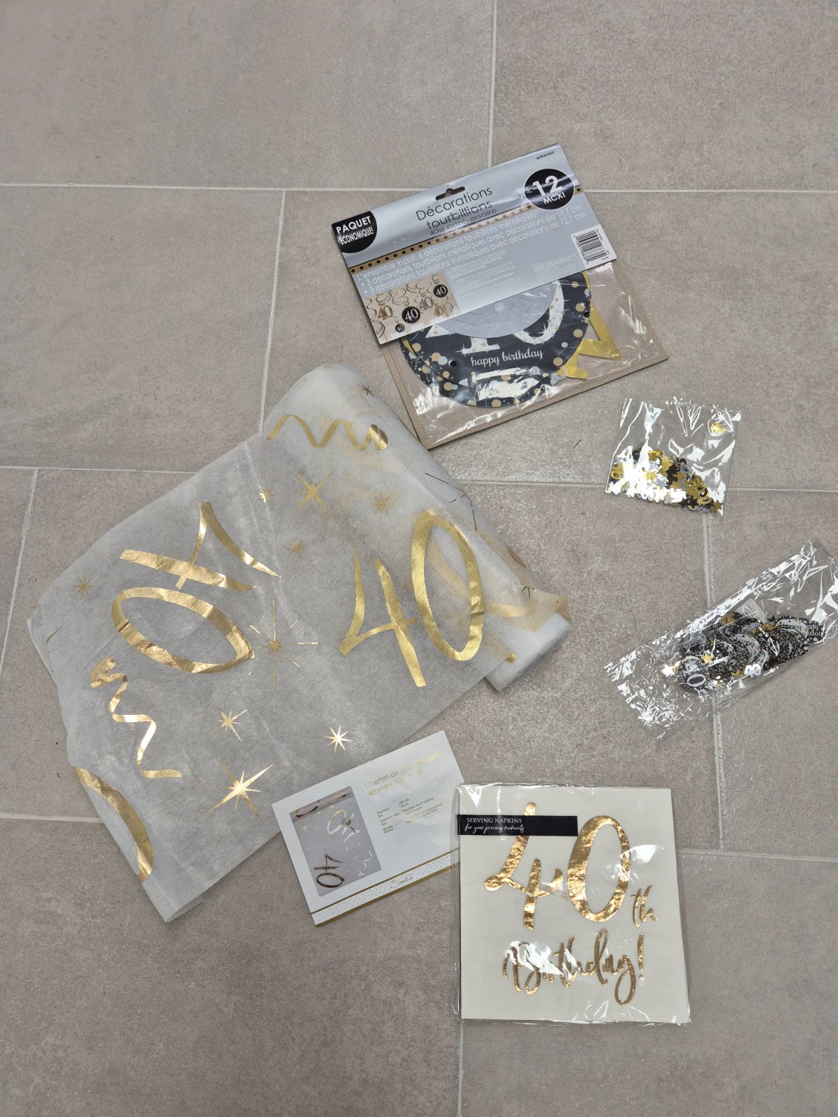 Balíček obsahuje šerpu na stôl , servítky už rozbalené, konfety na stôl 2 rôzne druhy, visiace ozdoby s číslom 40