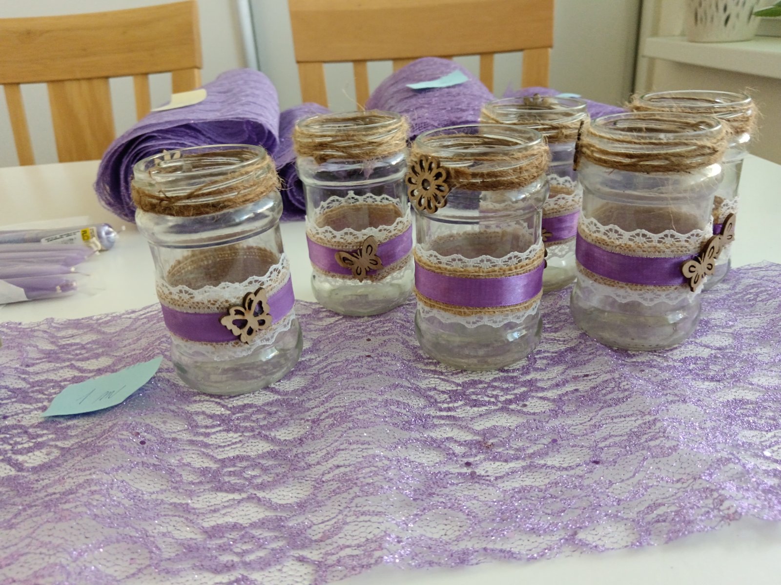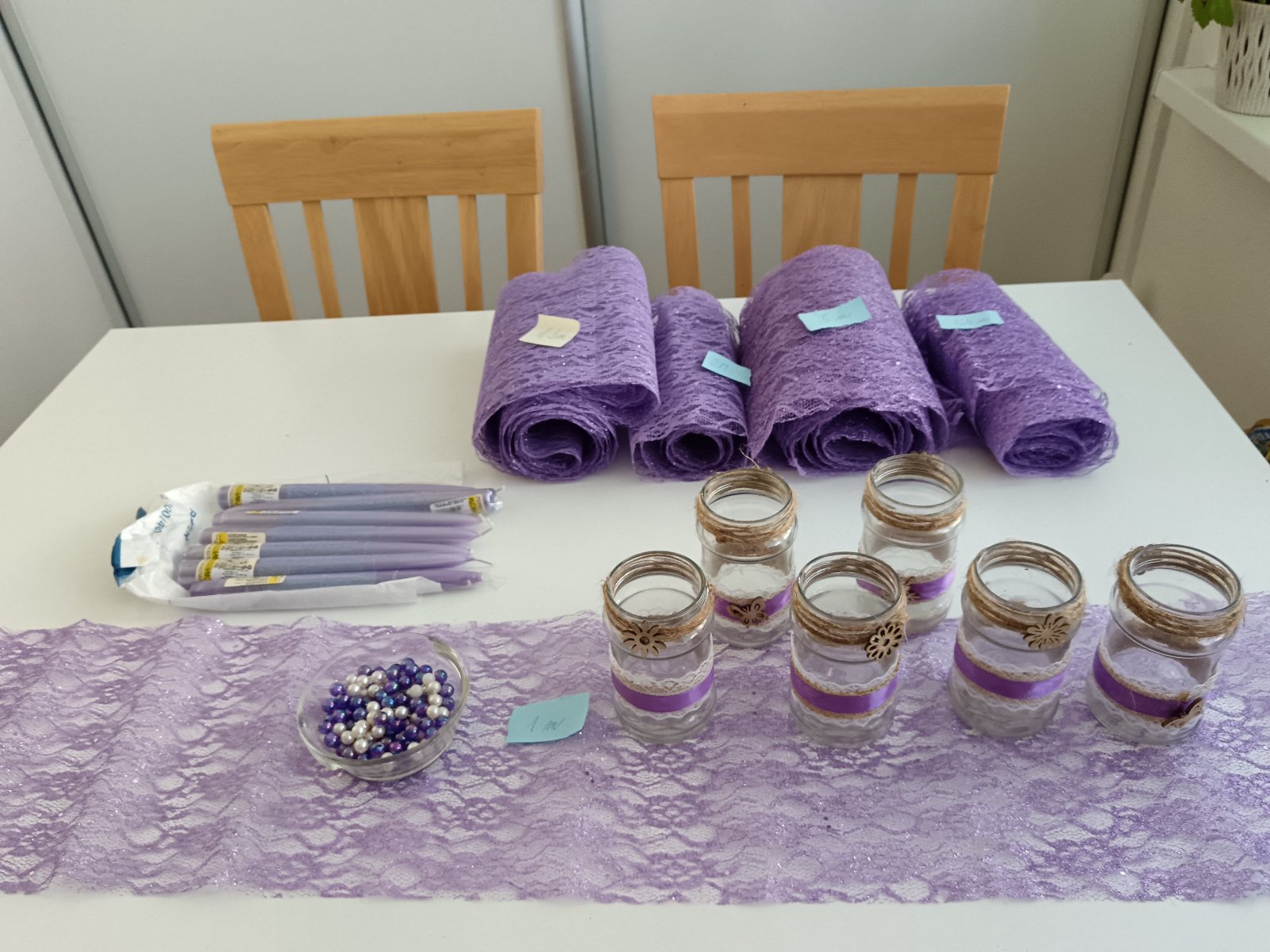 Fialová výzdoba. Fialová organza spolu cca 20 metrov, 7 kusov sviečka, 6 kusov vázička na kvety alebo ak dáte na dno kamienky, tak to môže byť aj svietnik a perličky biele a fialové. Organza je trblietavá. Na pár miestach je kvapnuté od sviečky, dá sa to celkom dobre odlúpiť. Cena za všetko spolu.