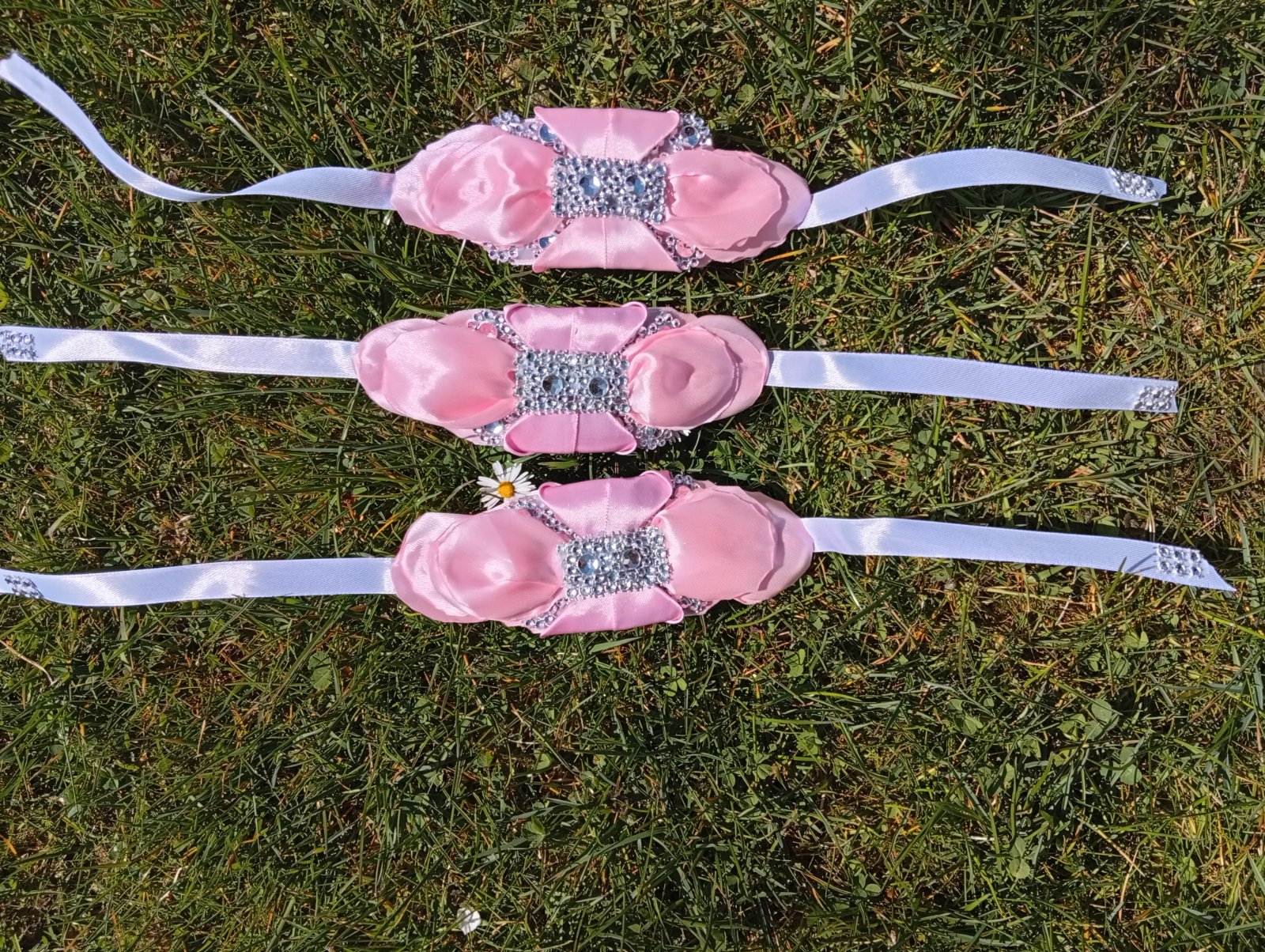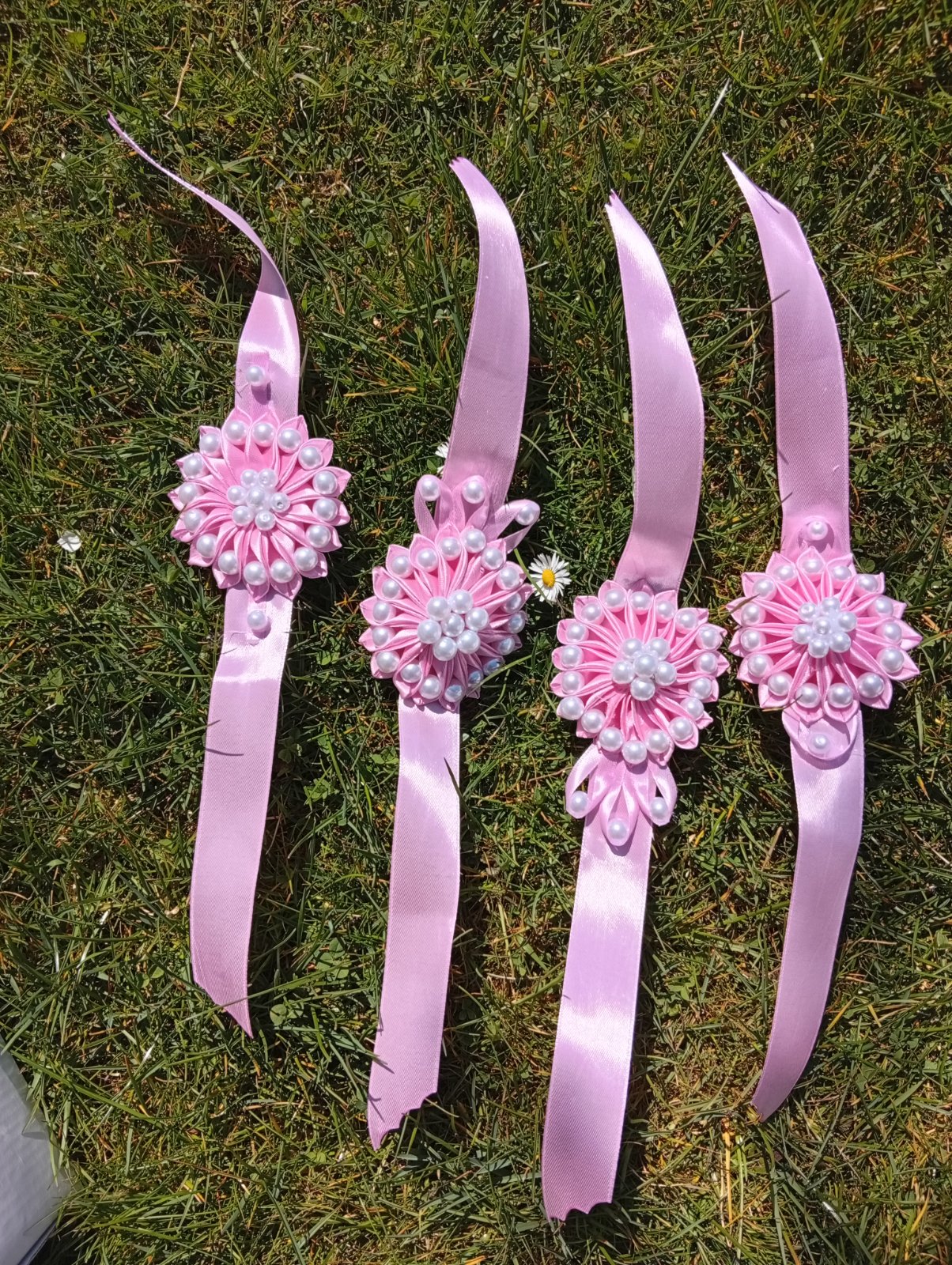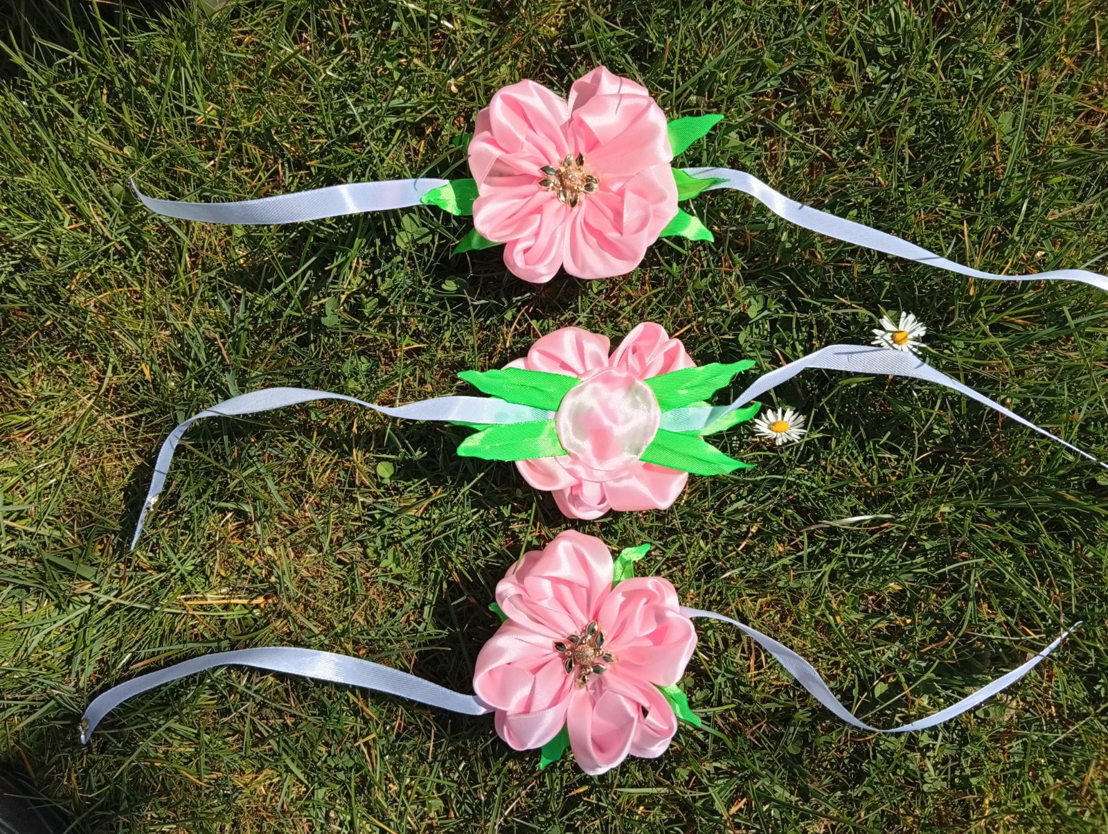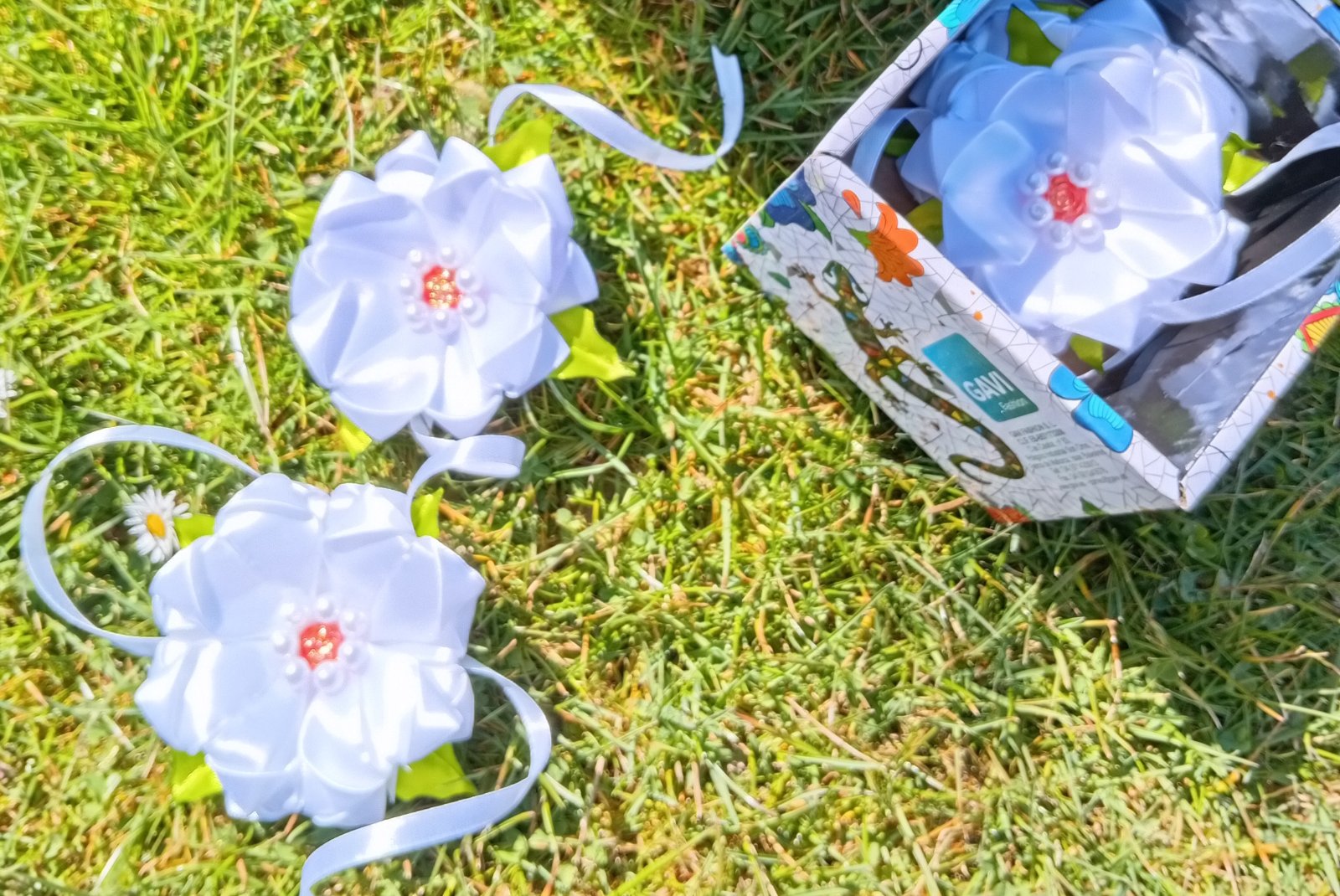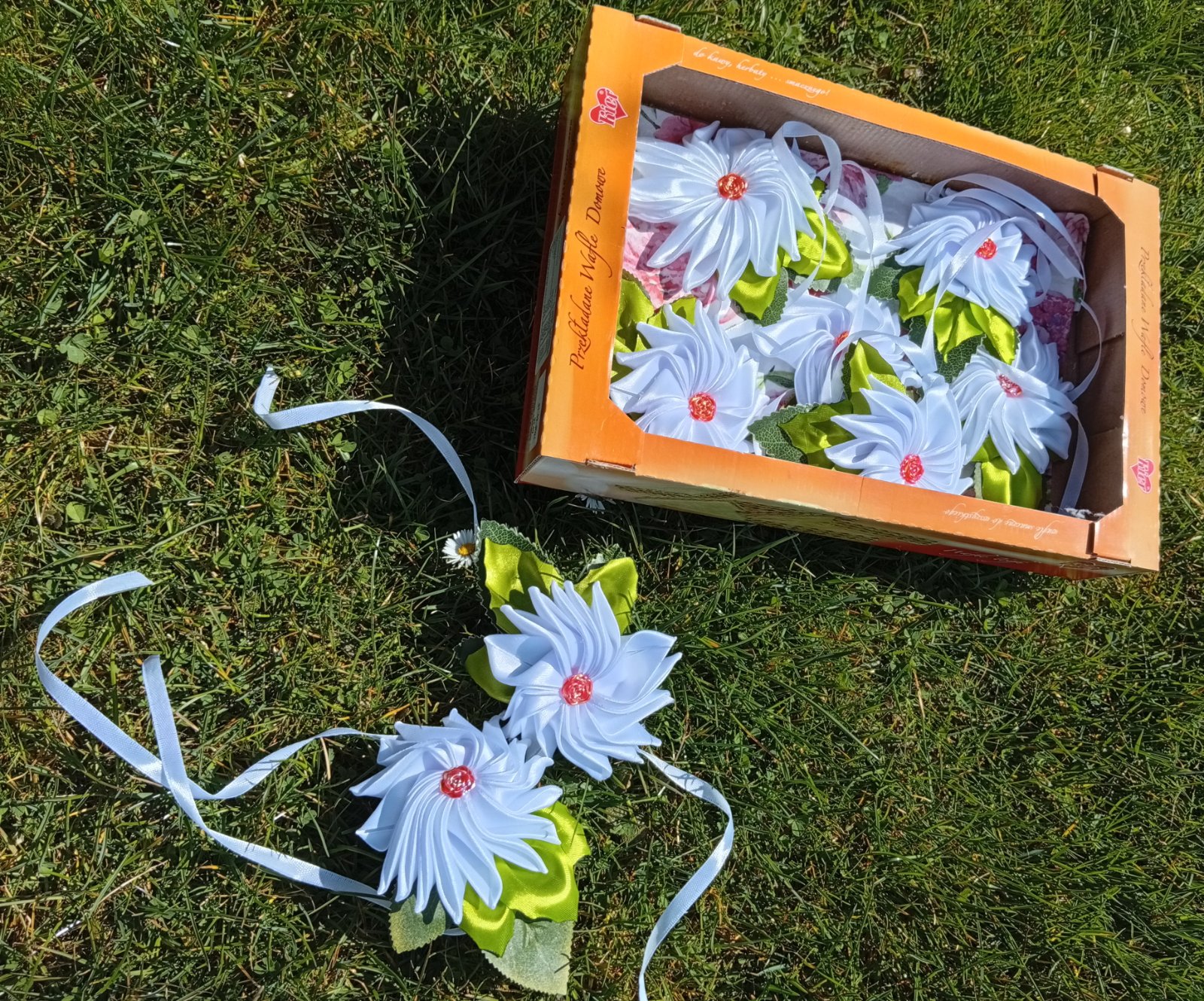 Ručné vyrobené zo satenovej stuhy ružičky a lístky. Počet na obrázku. Naramok pre družičky. Biele v počte 8 kusov. Dva krát. Krabičky. Cena plus poštovné. Osobný odber.