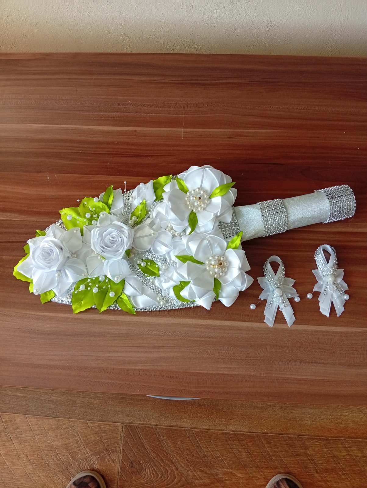 Ručné vyrobené zo satenovej stuhy ružičky a lístky, doplnky. Dĺžka 50 CM. V prípade ako svadobná kytica pierko pre ženícha. Cena plus poštovné. Osobný odber.