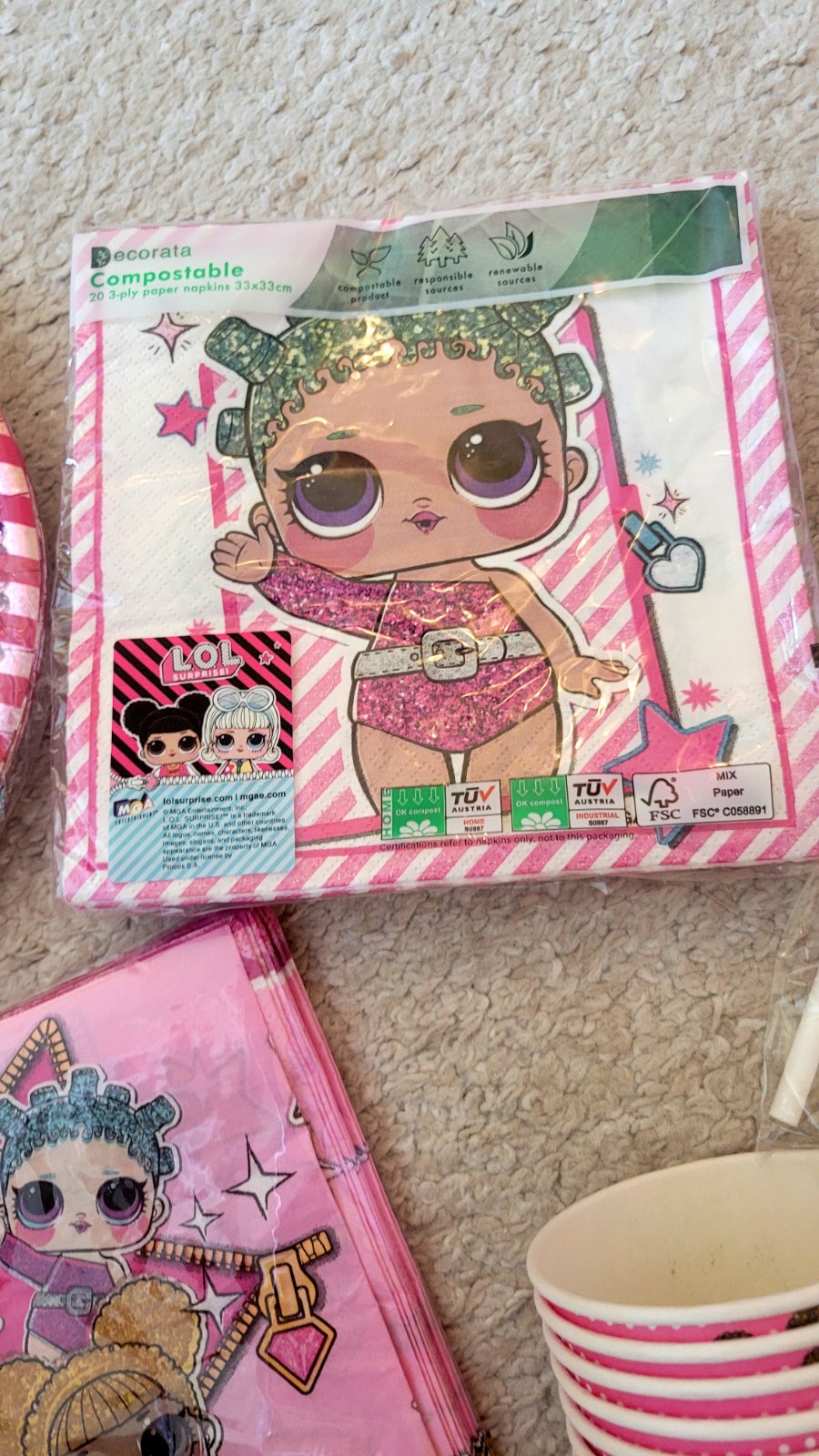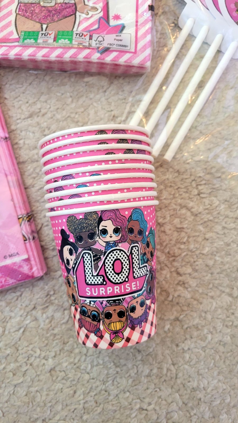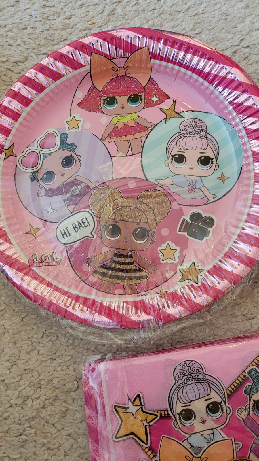 Predám party doplnky s motívom LOL. 2 x servítky LOL - jedny neotvorené 20ks, jedny otvorené 15 ks, taniere 8 ks, poháriky 8 ks, 2x nové zabalené slamky 2 x 4 ks.
