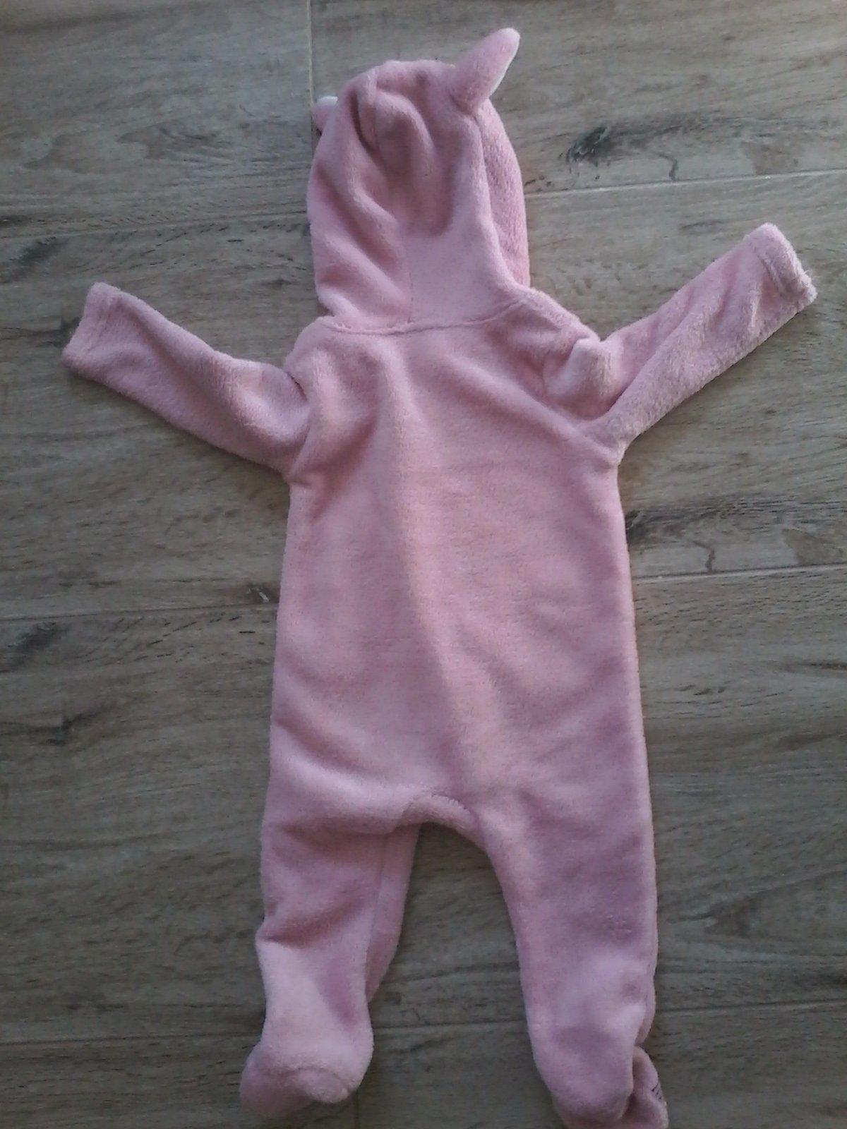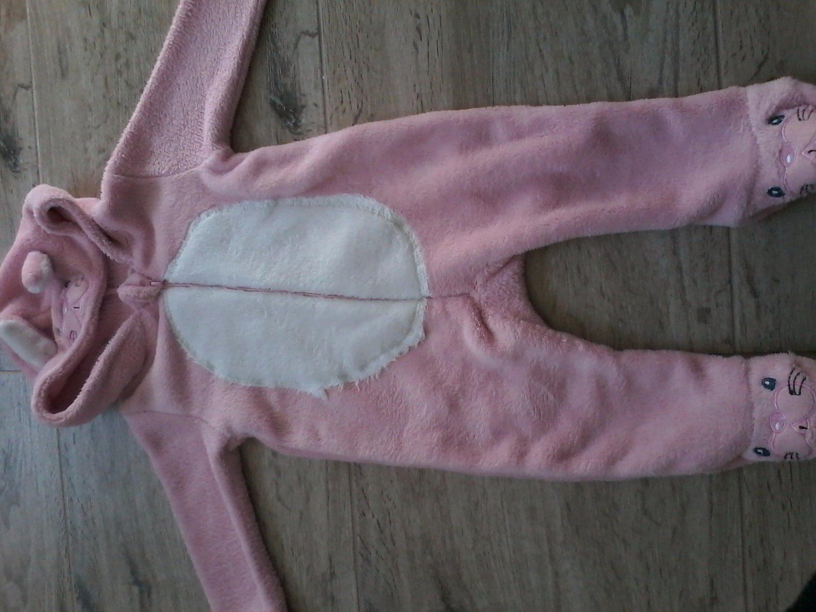 Chutný overal zajačik, oblečeny par krat, prijemny material. Ziadne poškodenia. Vel.je pisana 74 cm, mala ked mala 68 tak jej bol tak akurat.