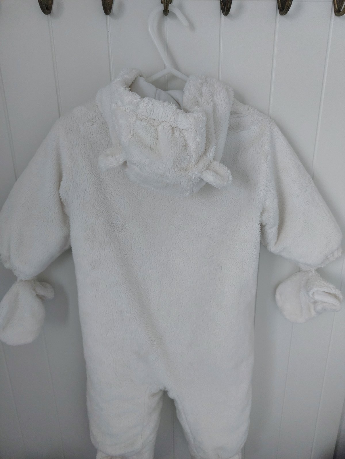 Hrubší overal s rukavičkami a kapucňou s uškami pre dievčatá aj chlapcov vo veku 6-9 mesiacov.