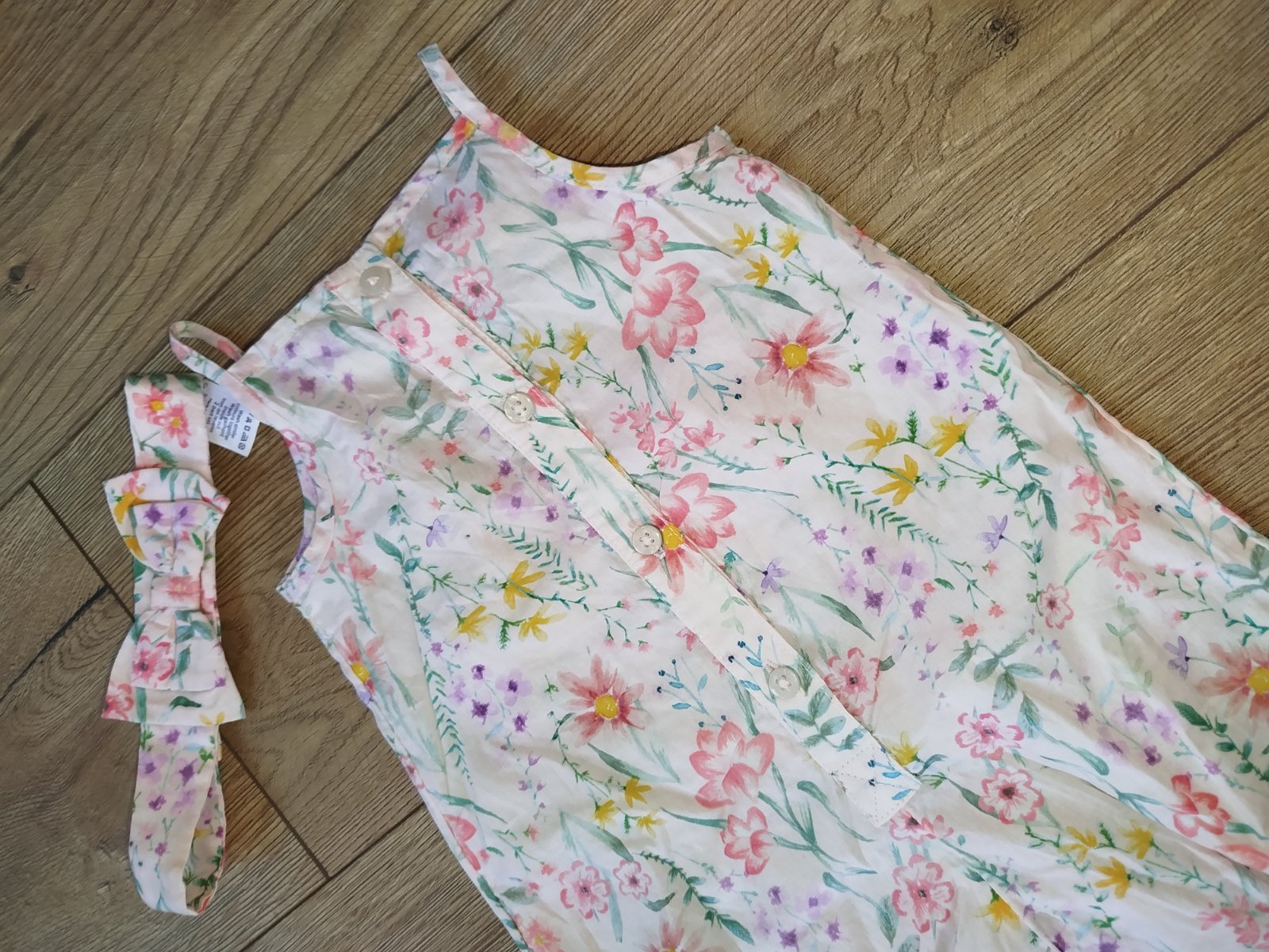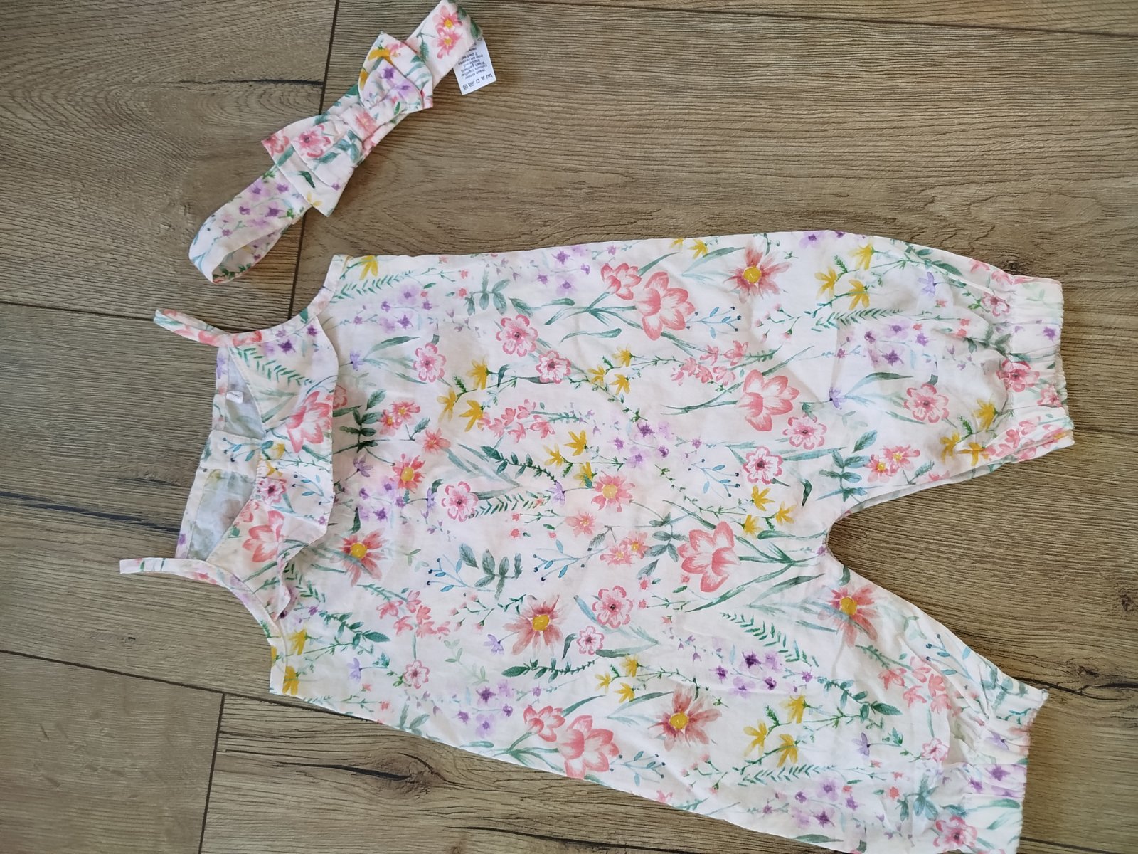 Krásny super letný overal veľkosť 0-3 mesiace vzdušný zapínanie medi nožičkami vzor jemných kvietkov +čelenka