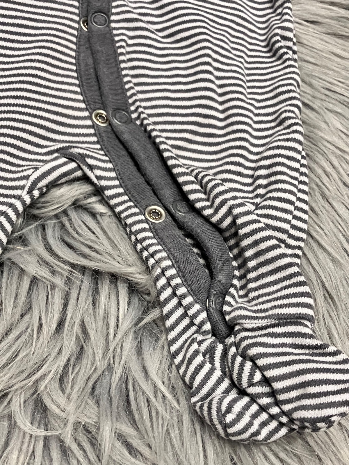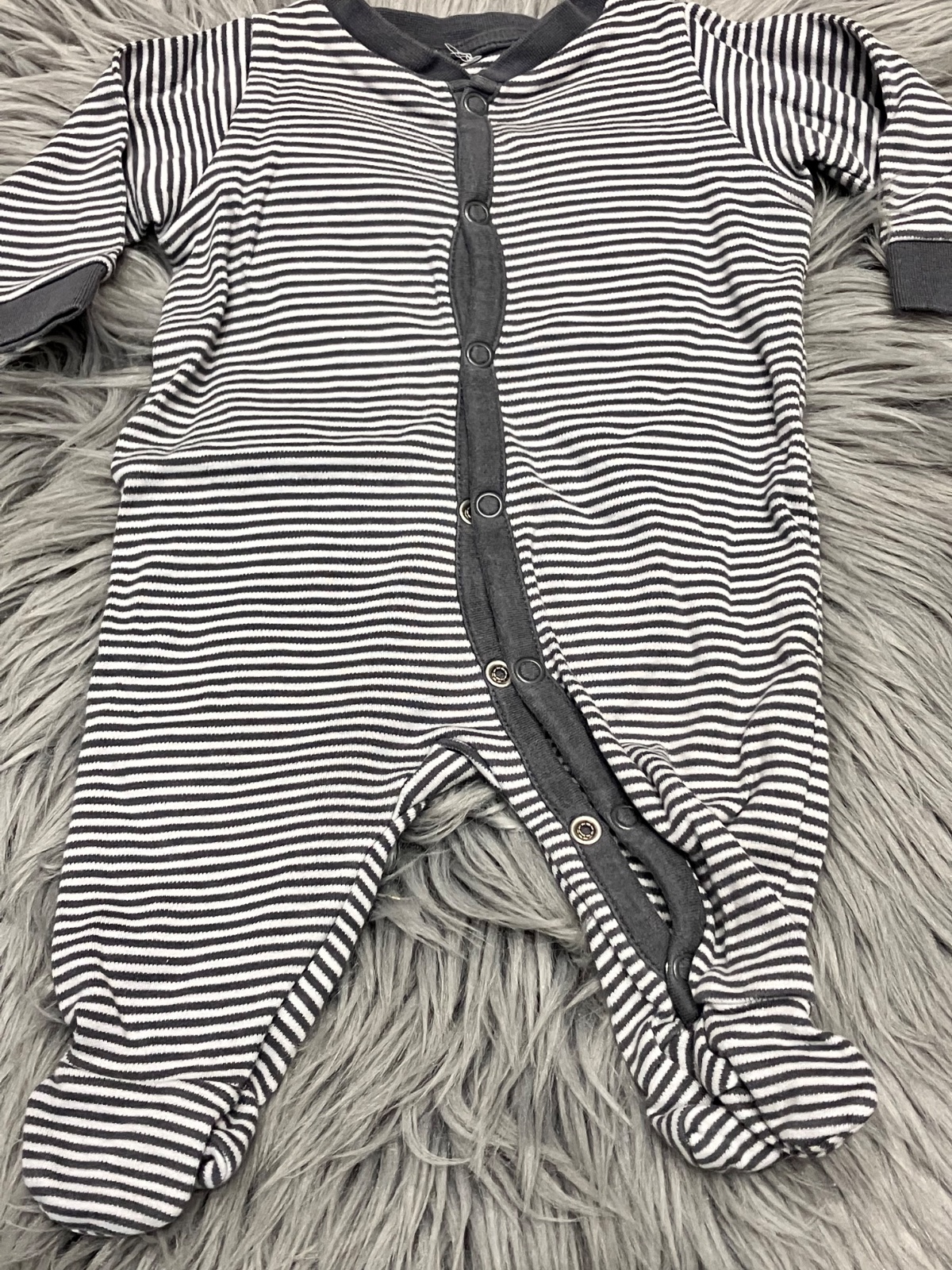Chlapčenský pásikavý overal s dlhým rukávom, elastický, tenký, zapínanie na cvoky, veľkosť cca 56.