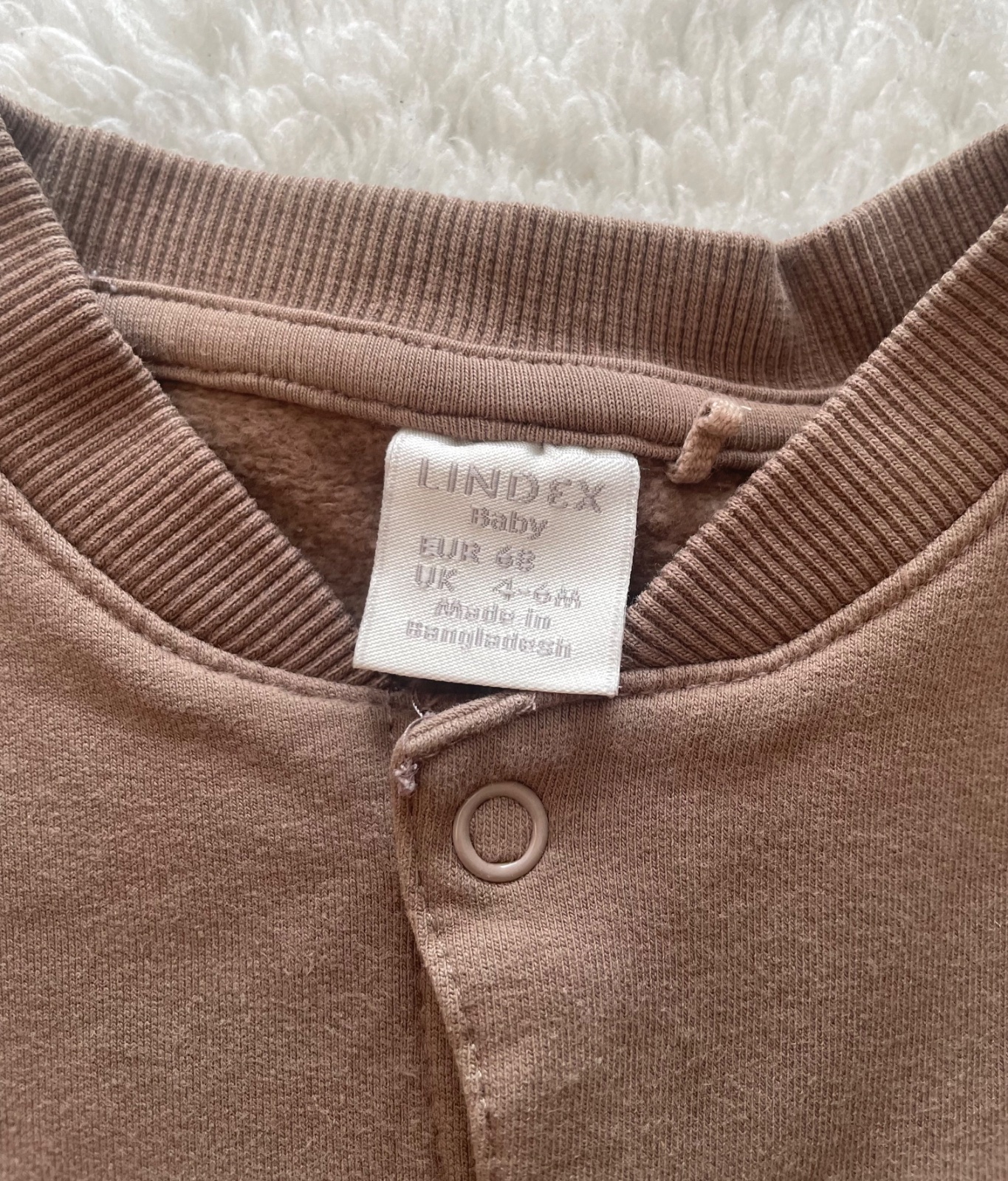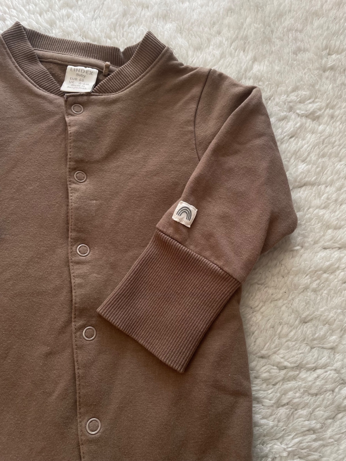 Makkucky kvalitny bledohnedy overal Lindex so zapinanim na cvocky, sucastou je ciapocka na uvazovanie so sobikovymi uskami. Velkost 68. Bez dier, avsak som si vsimla pri foteni fliacik, neskusala som uz vyprat.