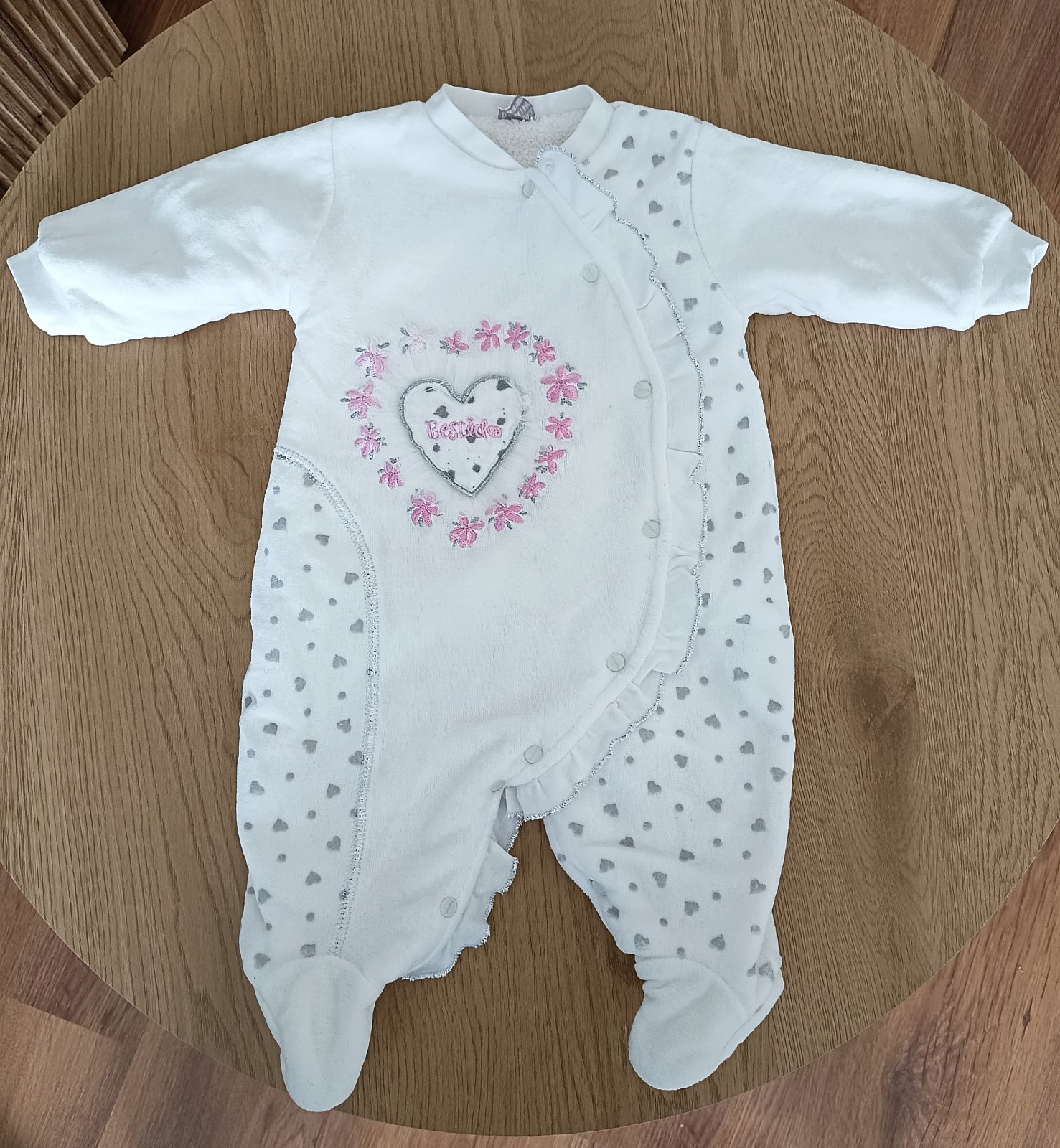 Krásny teplý velúrový overal, oblečený 2x, takže ako nový. Na bielych dupačkách je našitý kabátik s jemnými šedými hviezdičkami. Vhodný aj na krstiny. Celk.dĺžka 55cm. Šírka pod pazuškami 2x28cm. ...