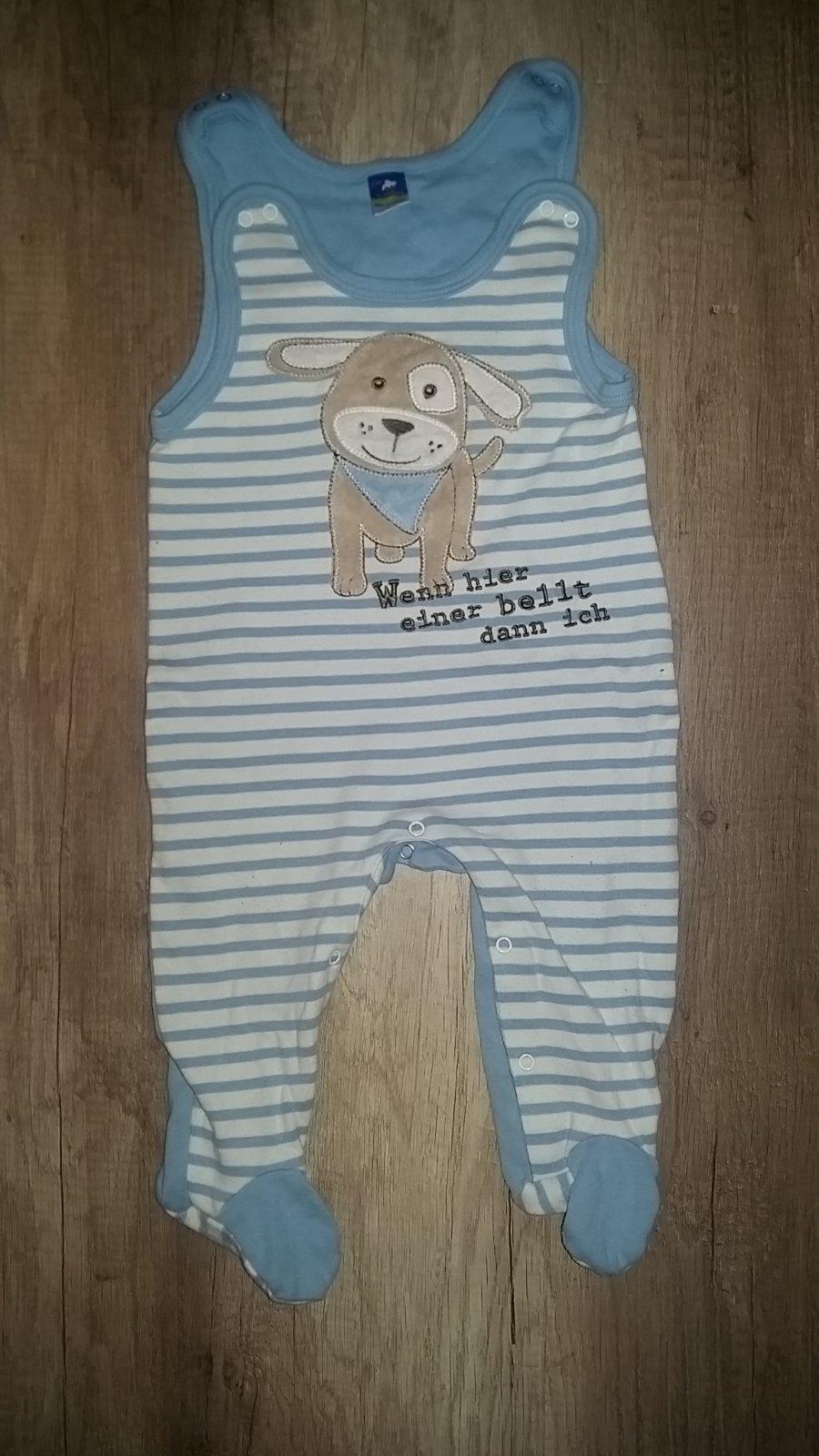 Krásne bledomodré dupačky, ako nové, oblečené pár krát (aj na privítanie do života :) ), vrchný materiál 80% bavlna, 20% PES, podšívka 100% bavlna, vpredu aplikácia so psíkom a nápisom Miláčik.