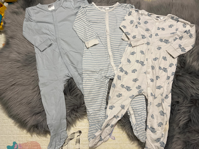 Dobrý stav, na pásikavých a sloníkových je nejaký ten fliačik, H&M, veľkosť 86, 12-18 mes.