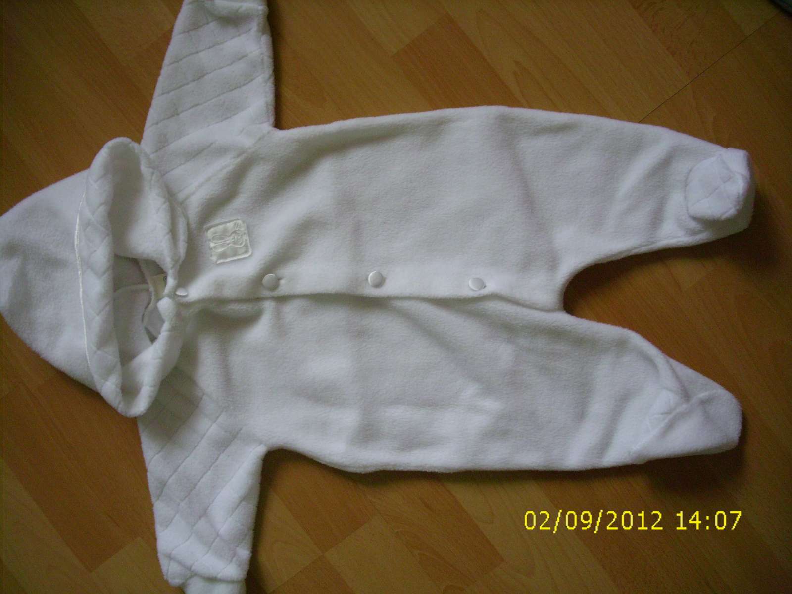 krásny snehobiely overálik na zimu pre dievčatko z tenšieho flísu, príjemný na dotyk, na gombíčky s aplikáciou zajka, zn. New baby, v. 3-6m , záleží od bábätka,