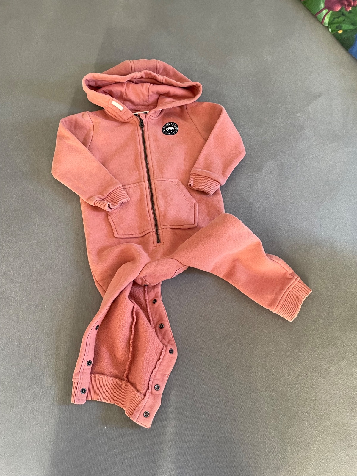 Teplucky flisovy overal v peknom nosenom stave, veľkosť 86/92. Žmolky na lemovaní, inak krásny zachovalý stav po 1 dieťati.