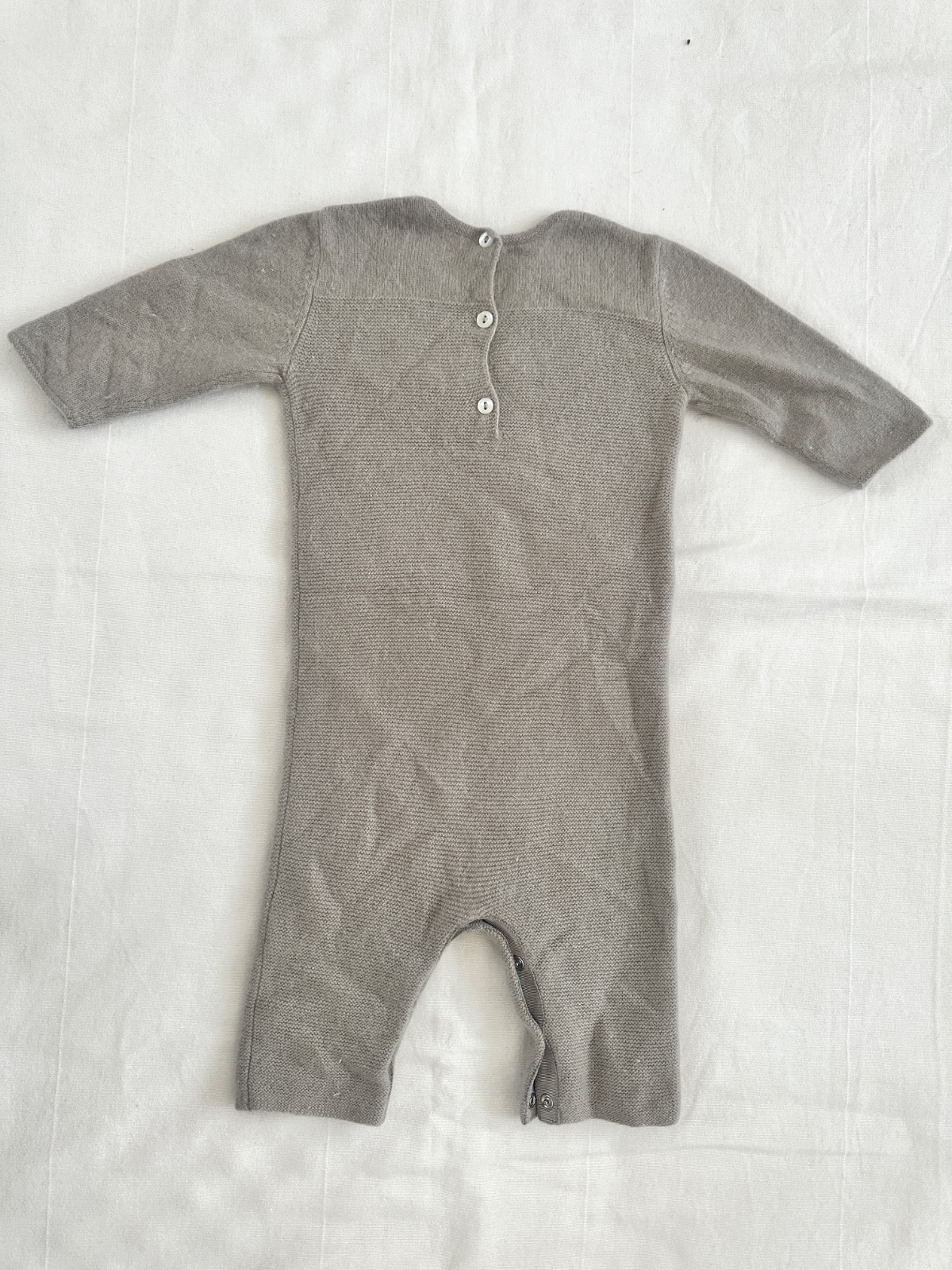 Kašmírový overal od prémiovej značky Bonpoint vo svetlo šedej farbe. Overal má zapínanie na chrbte v podobe malých gombíkov aj medzi nožičkami na rýchlu výmenu plienky. Je vyrobený z veľmi jemného a hrejivého kašmíru (100% kašmír). Veľkosť na štítku je 3, teda 56-62. Katalógová cena je okolo 250 €. Overal má chybu v podobe 2 maličkých dierok zobrazených na poslednej fotke.