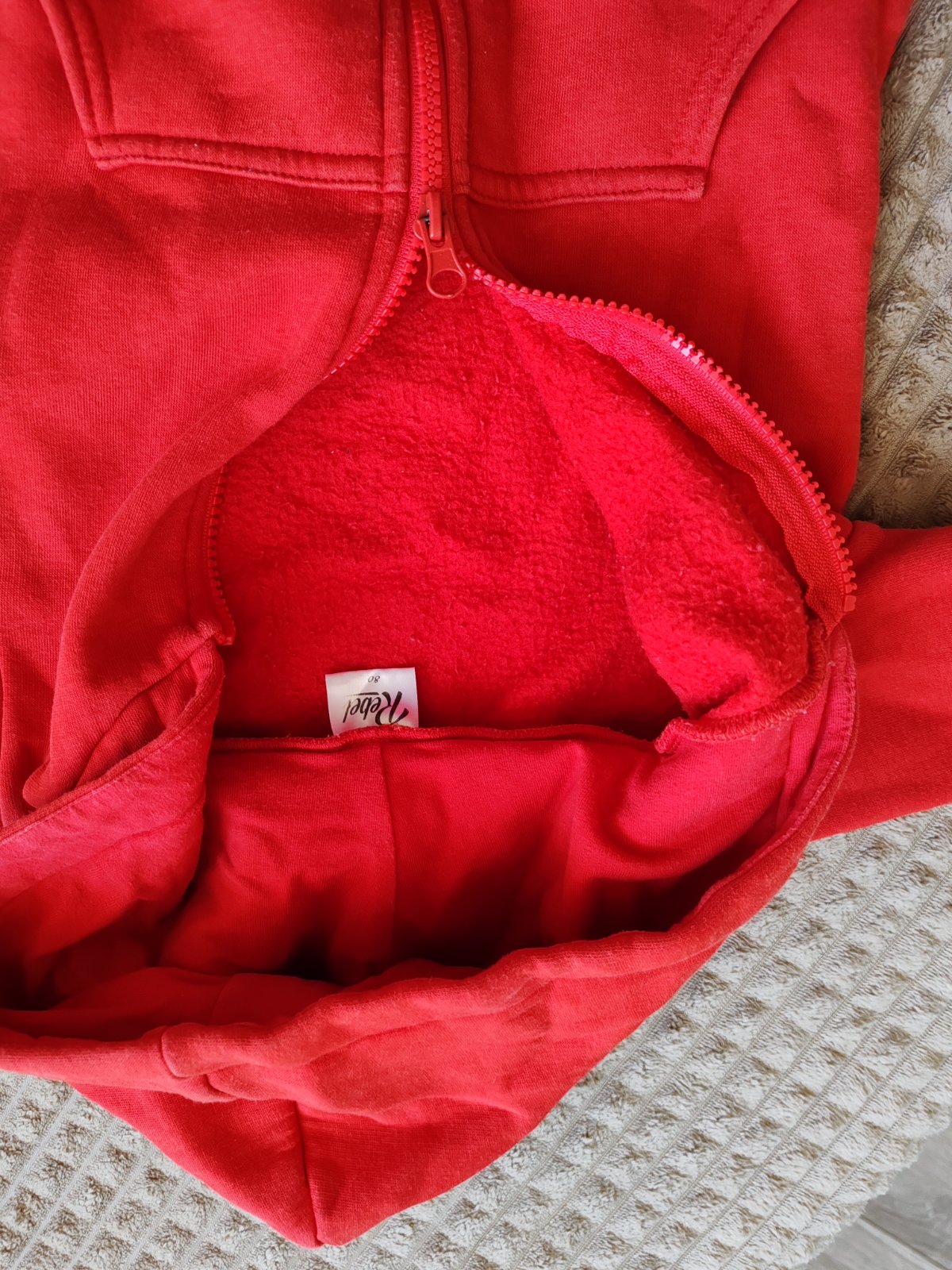 Pekný overal na jar a jeseň, je hrubší. Bohužiaľ vidieť pranie. Po jednom dieťatku, iné poškodenie nemá. Mam k nemu aj červenú čiapku. Cena prispôsobená.