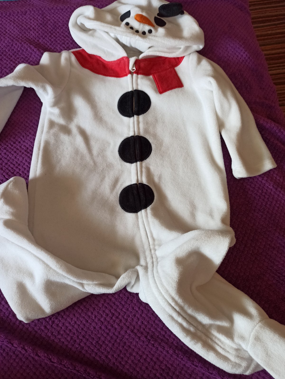 Odporúčané na 9 mesiacov, nosili sme ako jesenné dieťa do kočíka na prechádzku, na jednej nožičiek smuha, zapísaná sa na zips, výborná manipulácia, kapucka znázorňuje hlavu snehuliacika