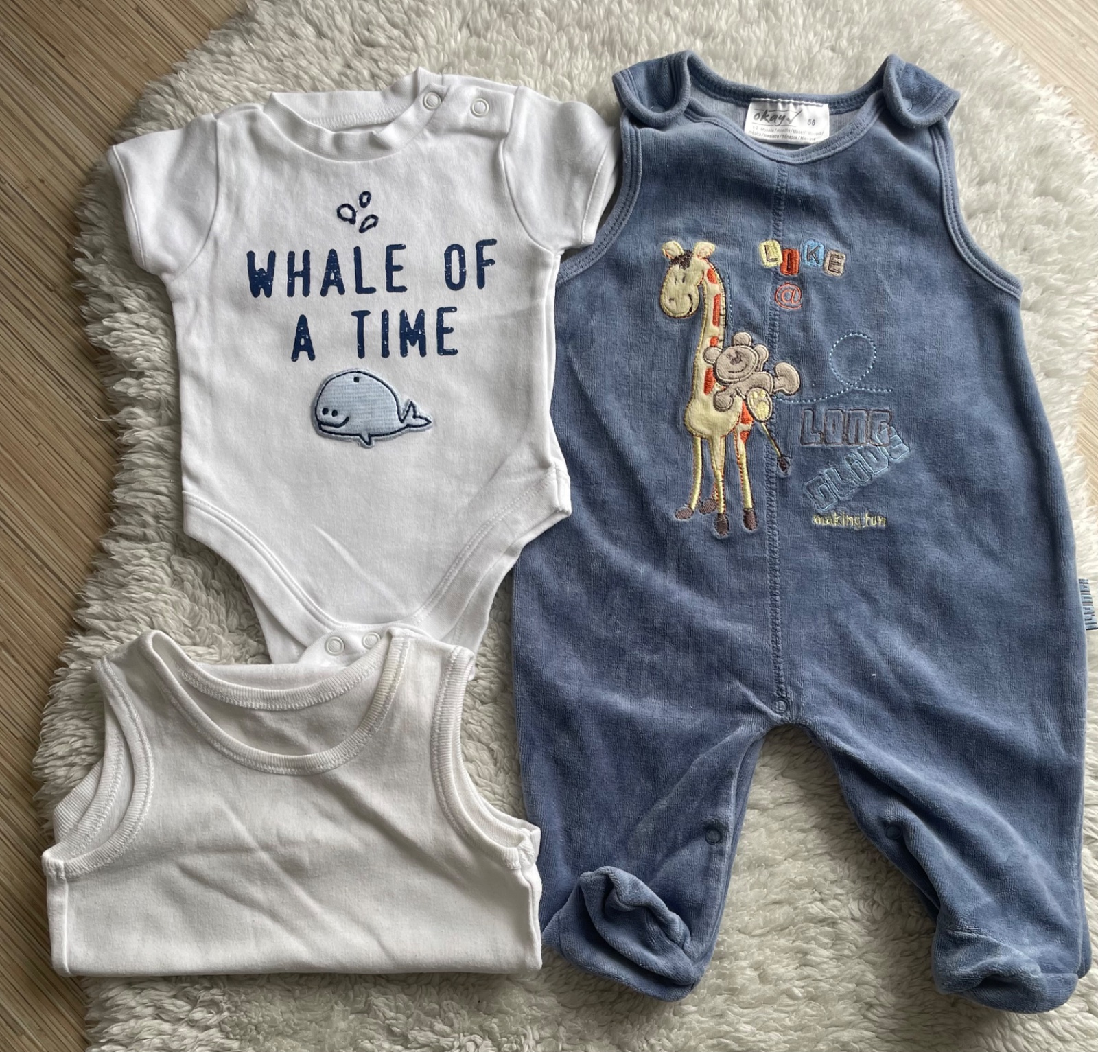 pribalim biele body s kratkym rukavom s velrybkou zn. F&F, velkost 1m, bezchybne a biele tielkobody zn.F&F vo velkosti 62 s fliacikom, neskusala som uz oprat