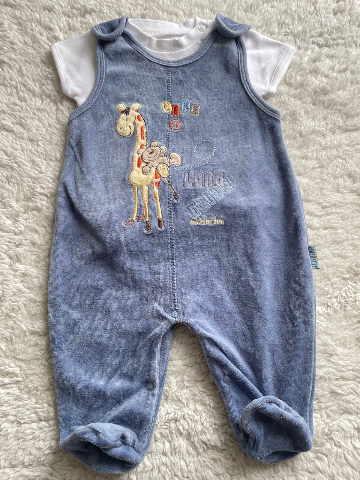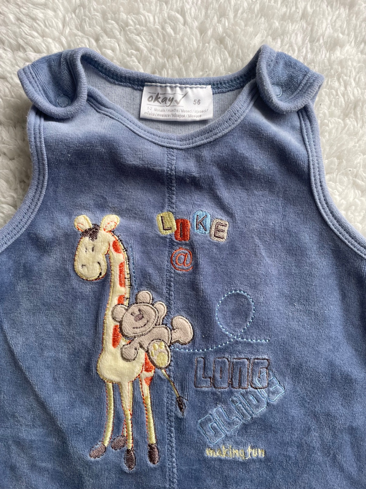 Plysove modre dupacky so zvieratkami, celodupackove, na cvocky pre lahsie prebalovanie, zn.Okay, velkost 56,