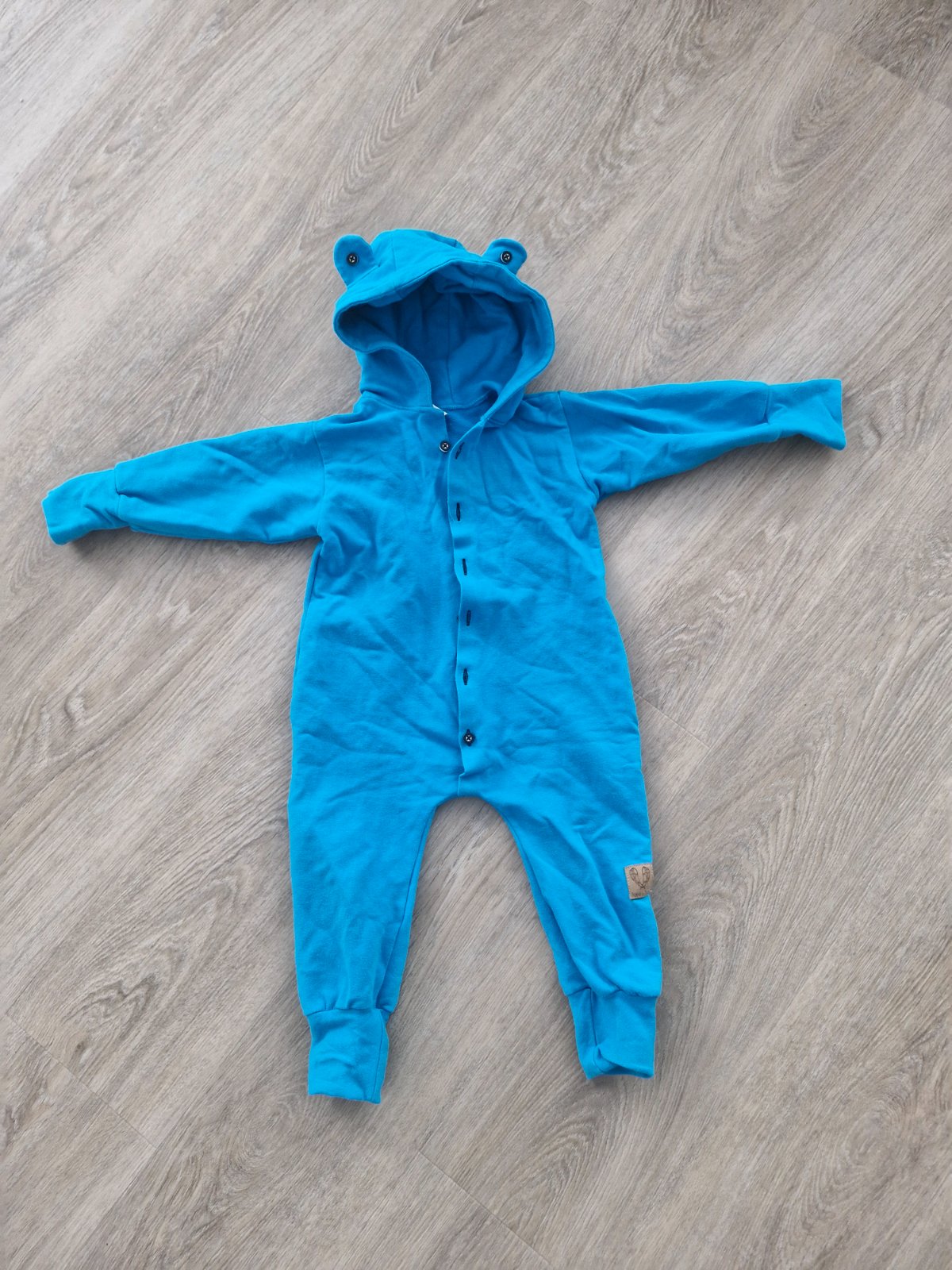 Krásny overal, bez poškodení v top stave. Rozopínacie nožičky na uľahčenie prebaľovania a na brušku klokania kapsa. Veľmi pekná farba, sivo-modrá.
