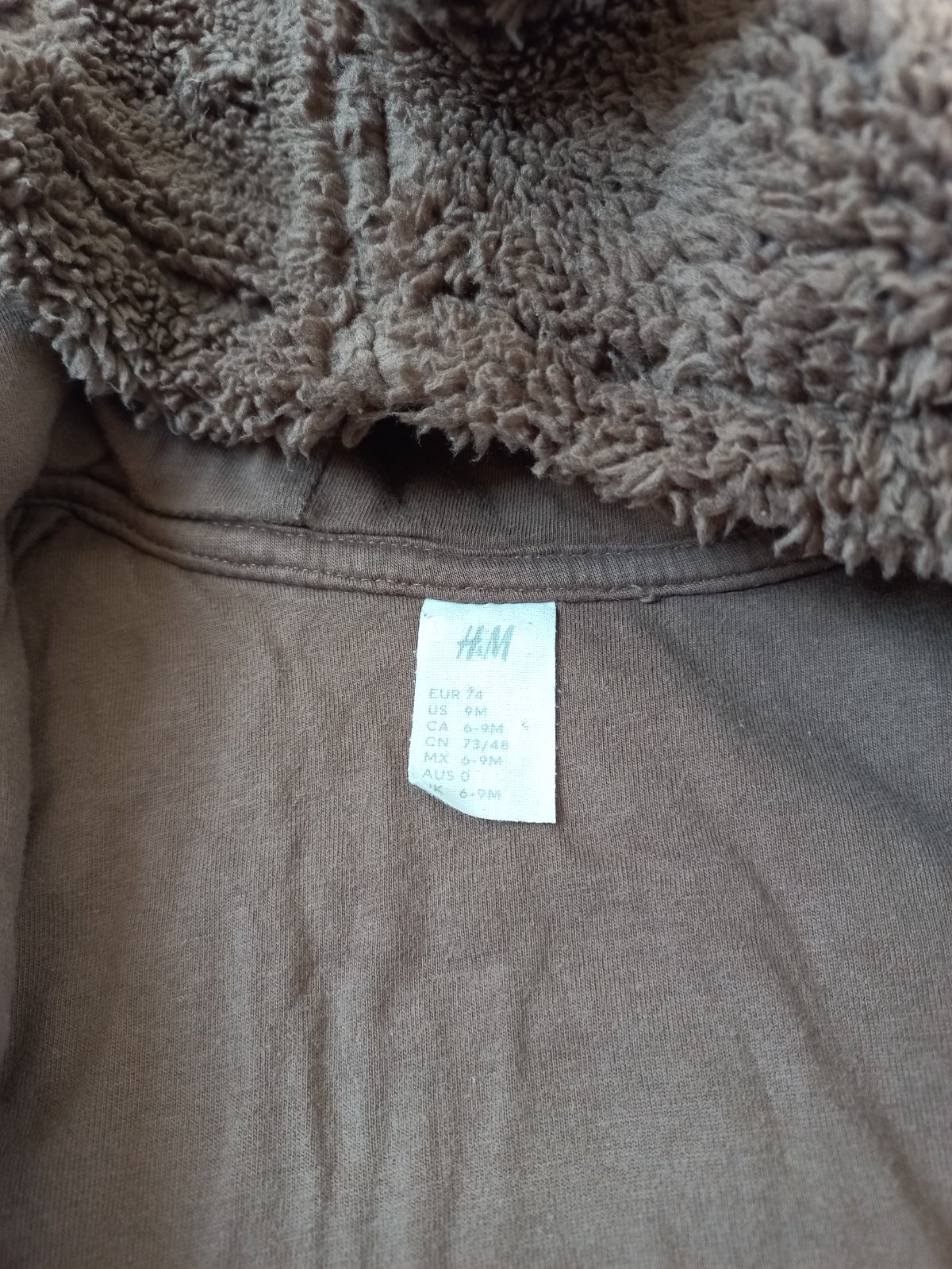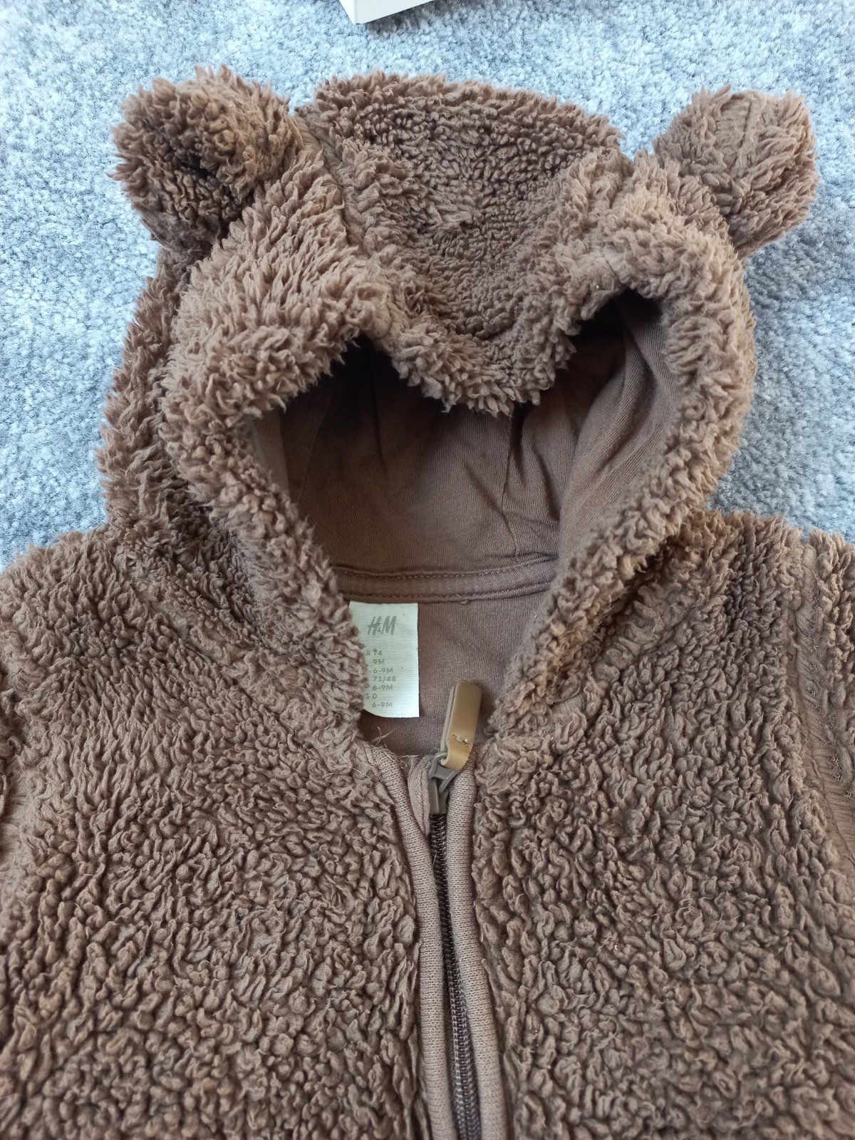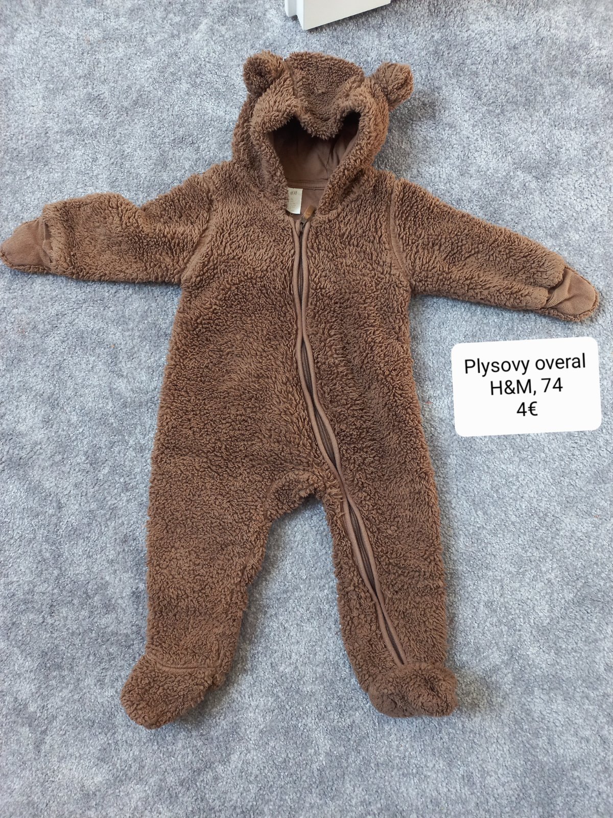 Noseny plysovy overal, podsity upletom, znacka H&M, velkost 74. Vynikajuci v zime do fusaku, nami oblubeny, jemne znamky nosenia - zlezaty barancek na niektorych miestach, pekny noseny stav. S nozickami, prekrytim ruciciek.